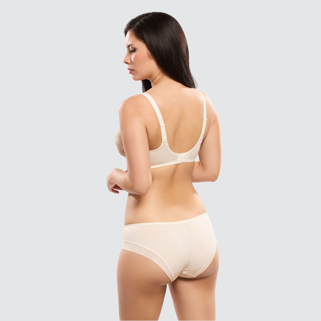 The Alix low low-necked underwired Bra features a demi-cup shape that enhances the neckline while offering gentle support. Non-padded cups provide a natural silhouette, complemented by decorative adjustable straps and a delicate jewel detail for an elegant finishing touch.