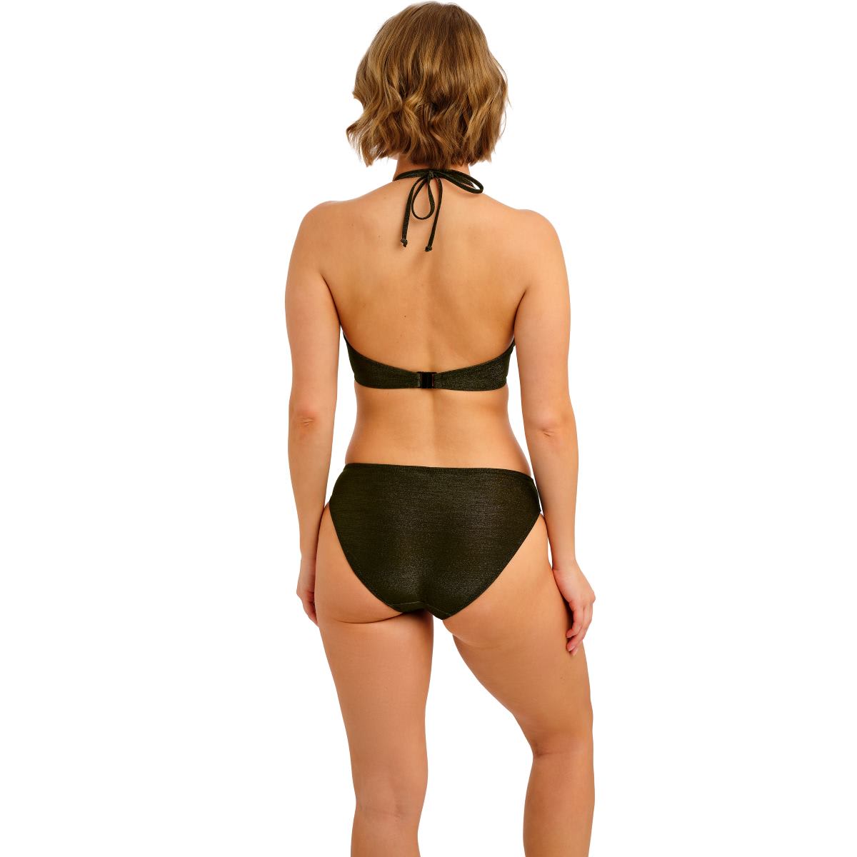 Make a statement with the Arizona Wave Halter Bikini Top. Featuring a sexy low plunging neckline for less coverage and powernet lined cups for shaping and support. The underwire without a cradle offers a lighter feel. Finished with on-trend metallic gold yarns and a bamboo gold ring detail at the apex.