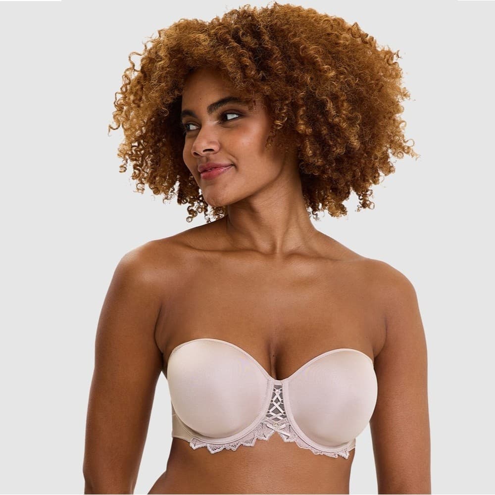 Strapless bandeau shape for an invisible effect. Underwired for excellent support. Soft and comfortable satin microfibre. Sexy fastening in the centre of the bust. Stretch lace underbust flounce. Removable and adjustable straps based on your comfort. Preformed cups to round off the bust with a natural effect.