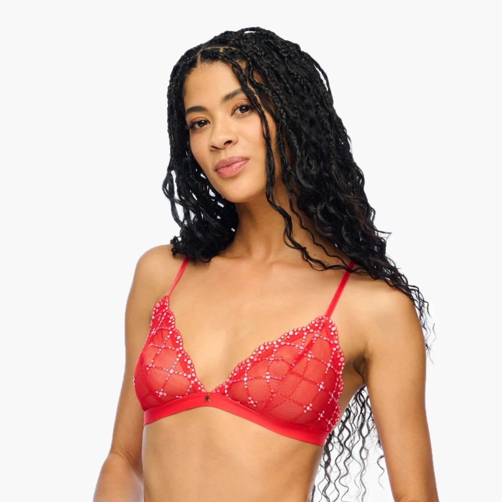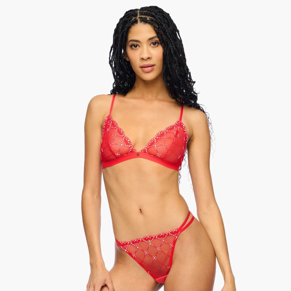 Wireless triangle-style Avventura Bralette. Crafted with Austrian geometric embroidery on sheer tulle.