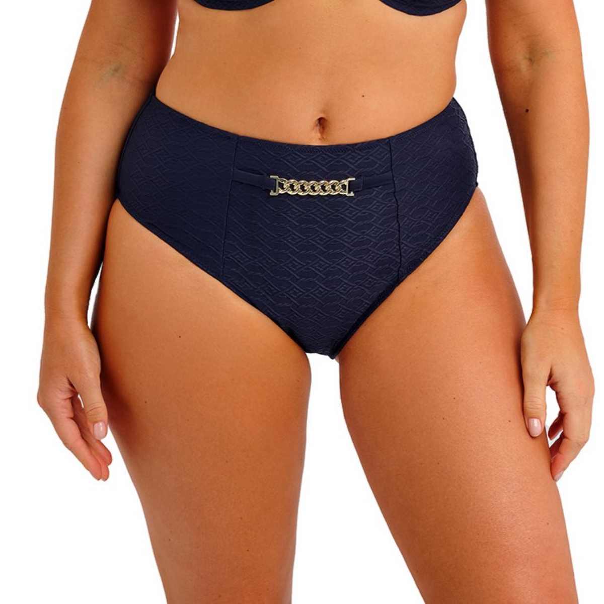 Flattering high-rise coverage with a higher-cut leg for a sleek silhouette. Fully lined for comfort and support, finished with a gold-coloured chain trim at the centre front for a chic belt effect.