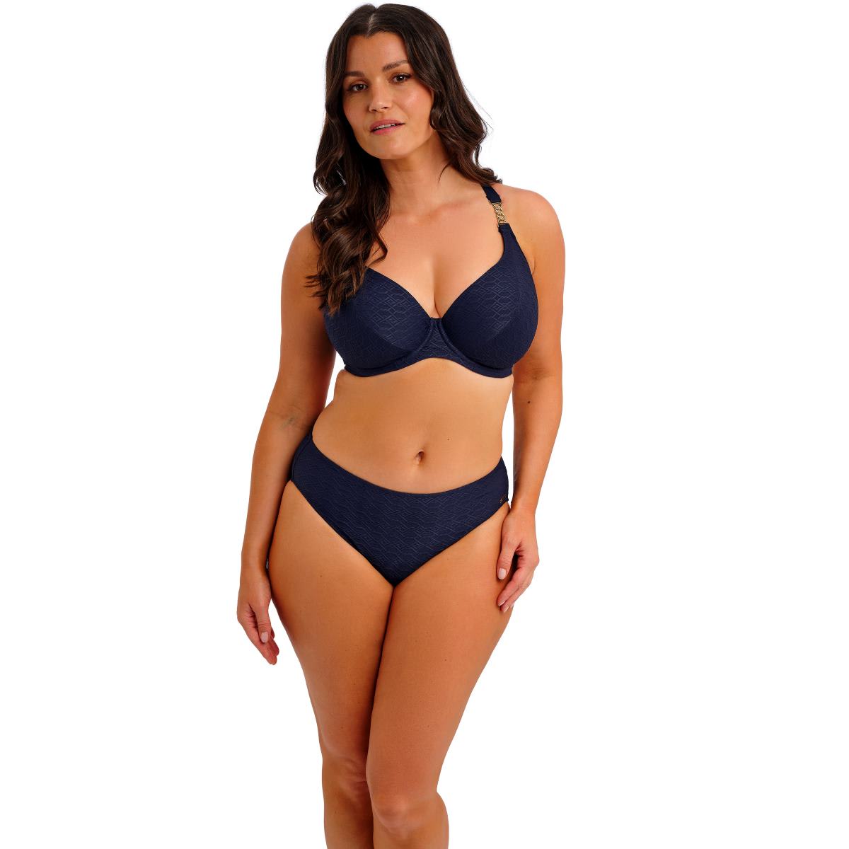 The textured knot-look design adds dimension, while gold hardware details give a luxe, sophisticated finish. Featuring a plunge neckline, lined cups, and powernet-lined wings for support, this piece offers both shape and comfort. Fully adjustable, convertible straps allow cross-back or over-the-shoulder styling, with a gold chain detail at the apex that won’t heat up in the sun.