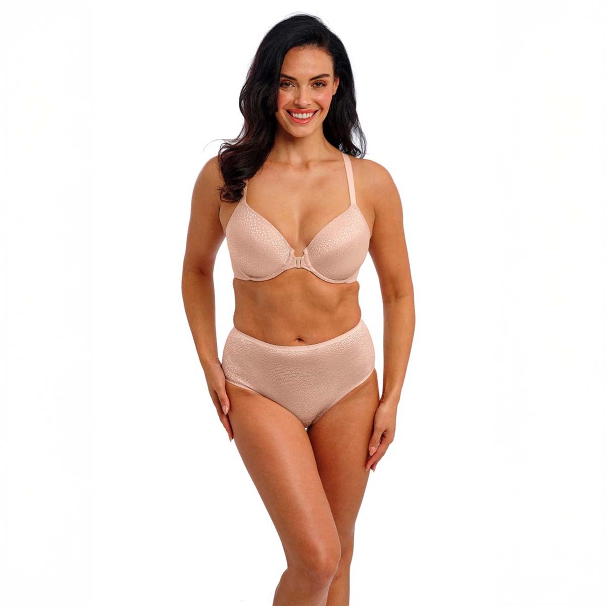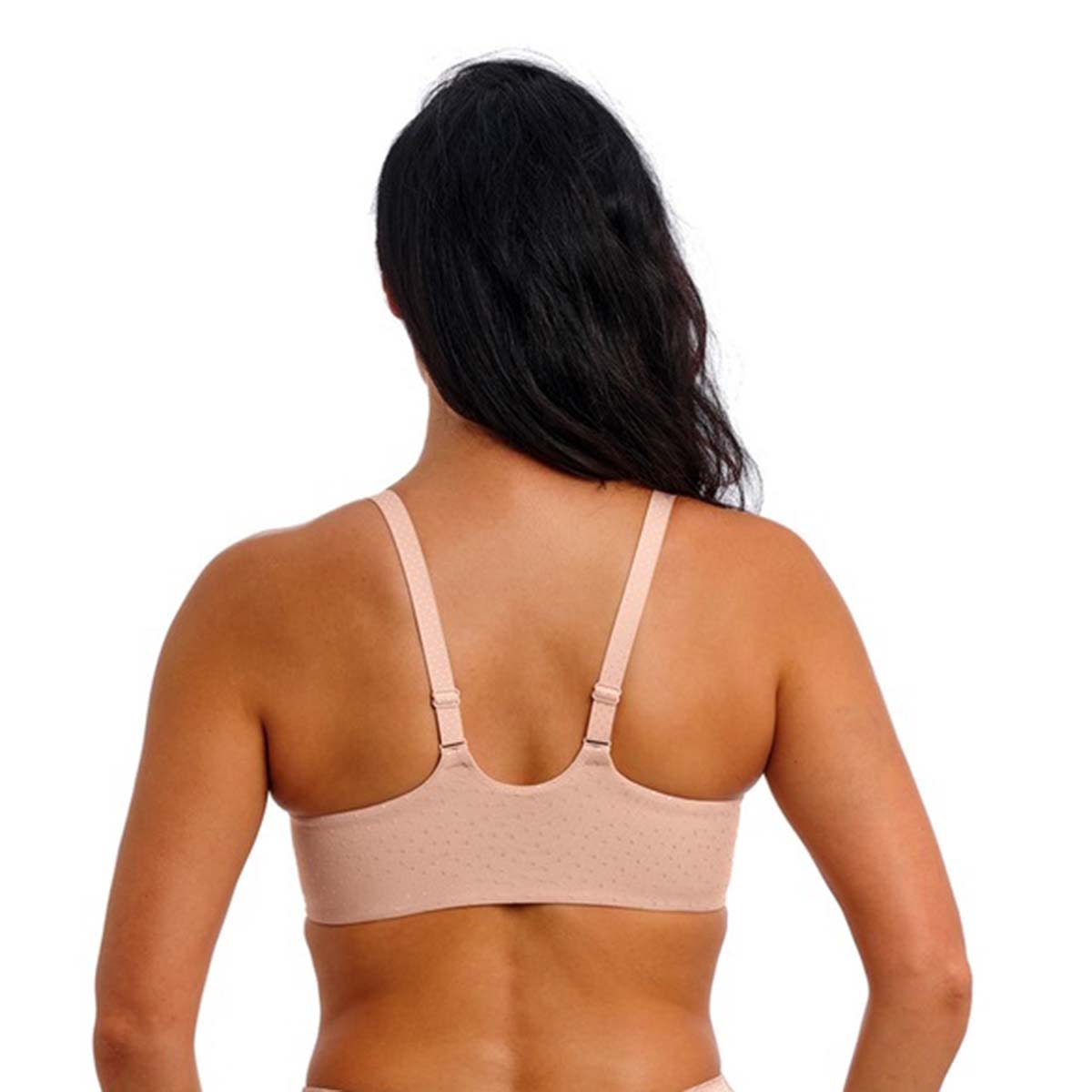The Back Appeal Front Fastener Bra is a comfortable and supportive front closure underwired T-shirt bra designed to minimize back and side bulge. It features full-coverage stretch foam cups covered in a pretty dot jacquard fabric with an accent sheen, and a low center front for versatility. The racerback is lined with microthin spacer fabric for a smooth look, while adjustable straps with matching dot detail ensure a customized fit. The barrel front closure locks securely in place for all-day confidence.