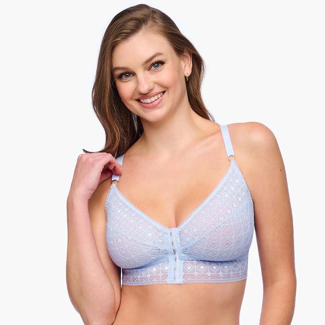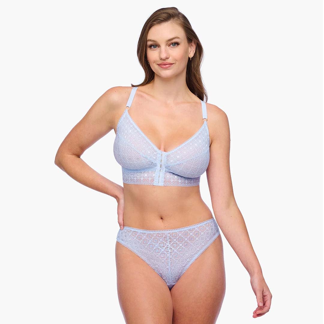 This front-closure wireless bralette is designed specifically for smaller bands with fuller cups, offering both comfort and support. The Basilica Curvy Bralette is crafted from Italian corded lace with a bold architectural pattern; it features a racerback style with power mesh lining. Adjustable wide straps and supportive side panels provide a secure, flattering fit.