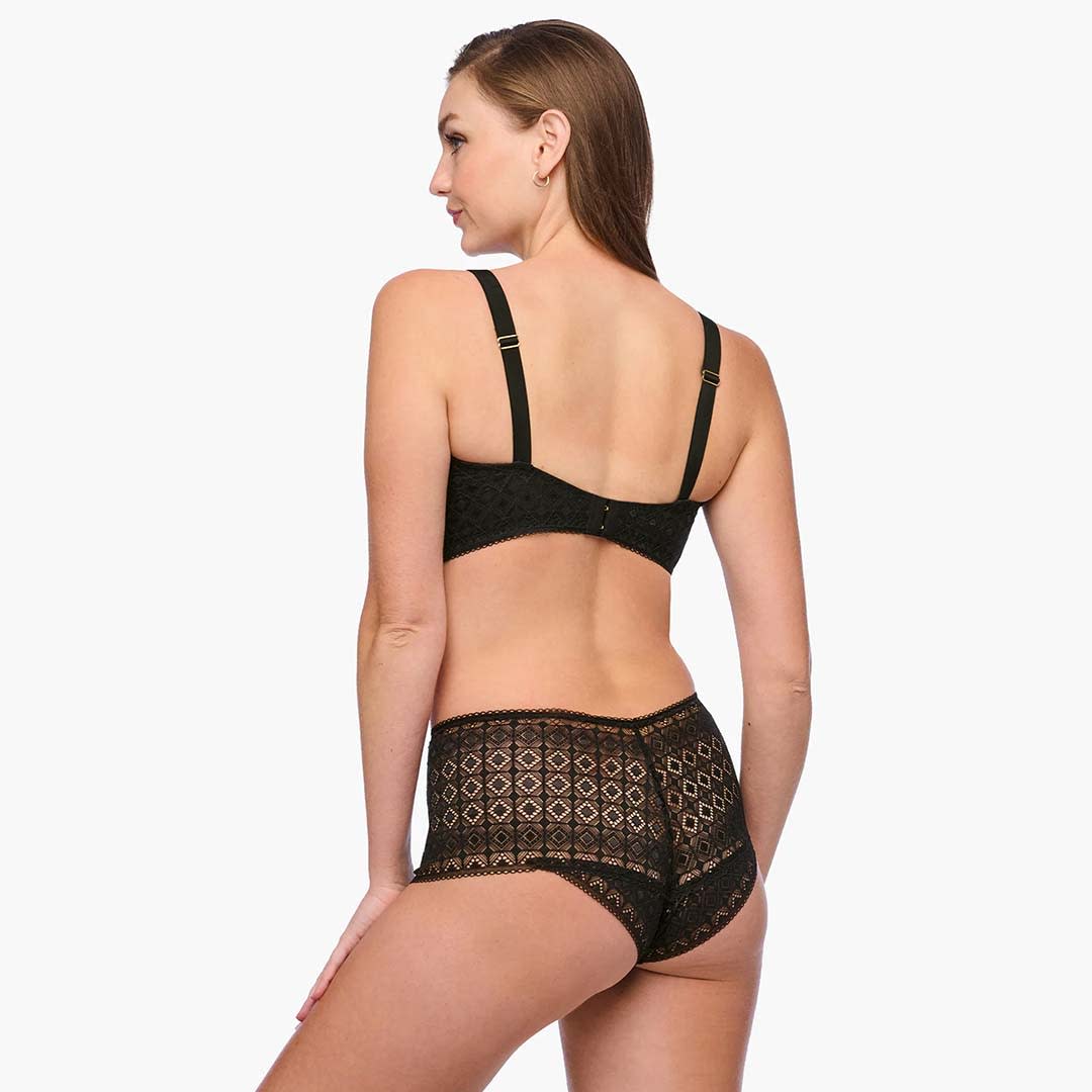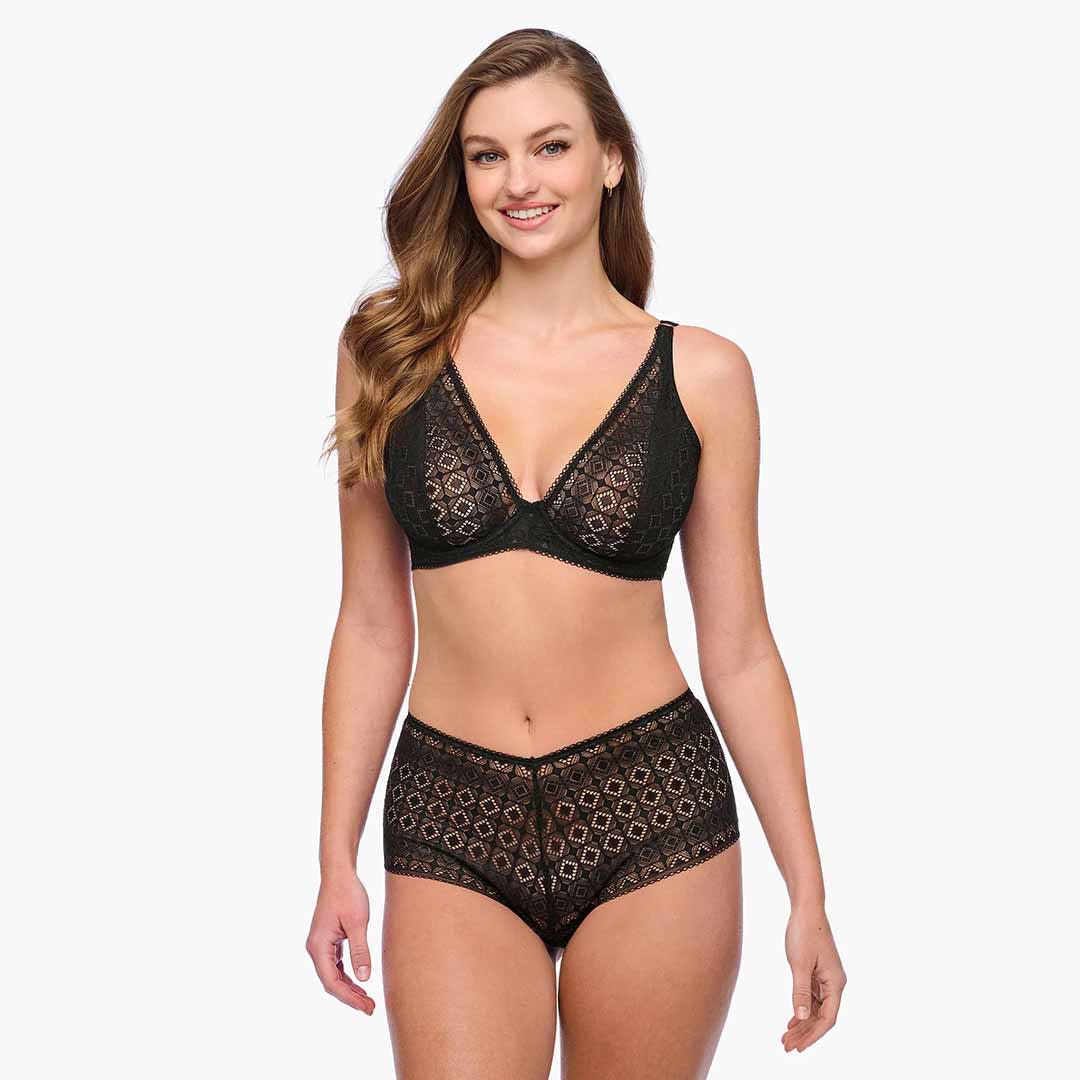 This Basilica Plunge underwire bra features a deep plunge front, crafted from soft, stretch Italian corded lace with striking architectural detailing. Adjustable straps and a hook closure ensure a comfortable, customized fit.