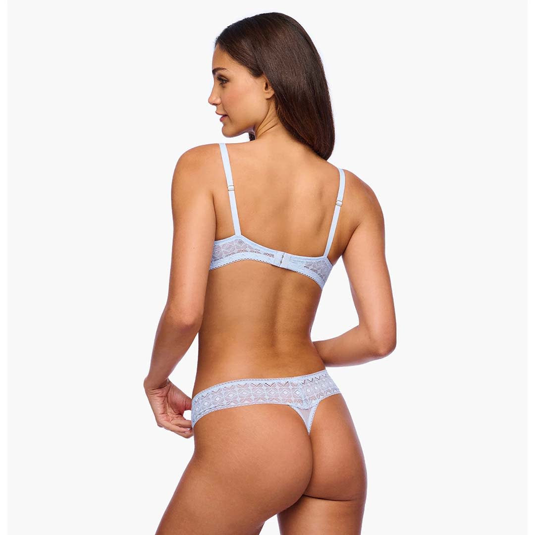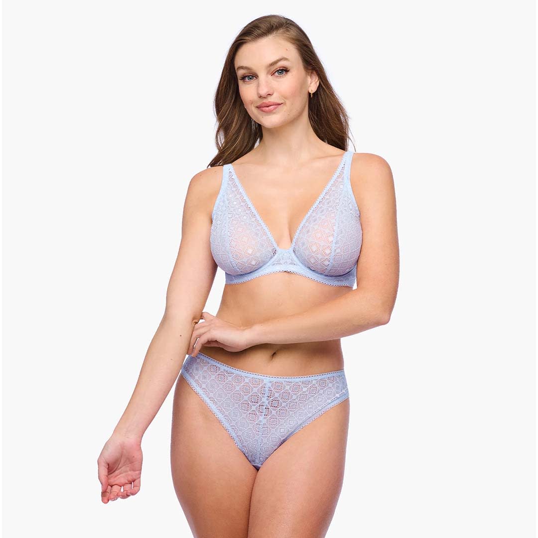This Basilica Plunge underwire bra features a deep plunge front, crafted from soft, stretch Italian corded lace with striking architectural detailing. Adjustable straps and a hook closure ensure a comfortable, customized fit.