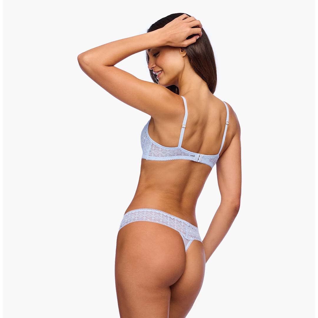 This Basilica mid-rise lace thong features a wide, soft lace waistband for a smooth, dig-free fit. With minimal rear coverage and a breathable cotton-lined interior, it offers both comfort and elegance.