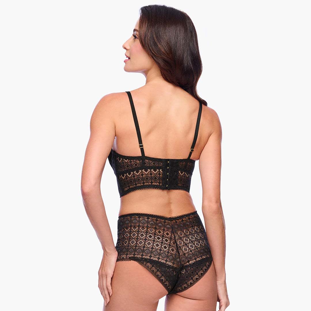 This underwire balconette bra features vertical boning for added structure and support. The non-padded cups include an external sling to create a subtle push-up effect, while adjustable straps and a hook-and-eye back closure ensure a perfect fit. The Basilica Underwire Bustier is crafted from Italian stretch lace with bold geometric detailing; it combines style and support effortlessly.