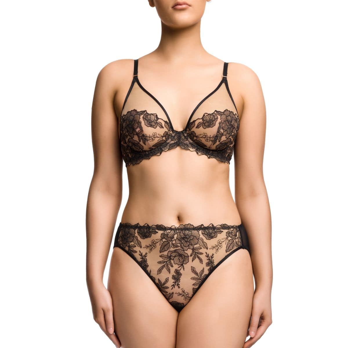 The Catalina Plunge bra is crafted from beautiful tattoo embroidery on soft stretch tulle for elegant easy fit and pure comfort. Catalina is a full coverage, non-padded plunge bra that supports and shapes the bust and creates a gorgeous cleavage. The shoulder straps are carefully positioned at the back of the bra to help prevent straps slipping over the shoulders.