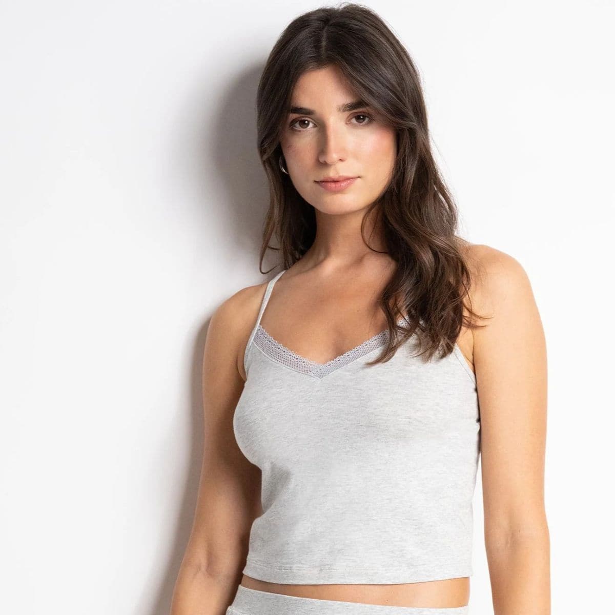 A crop top with thin straps. Short tank top, comfortable for everyday use to relax or sleep in style. Designed from an ultra-soft blend of cotton and modal, embellished with a refined lace trim for a feminine and elegant touch.