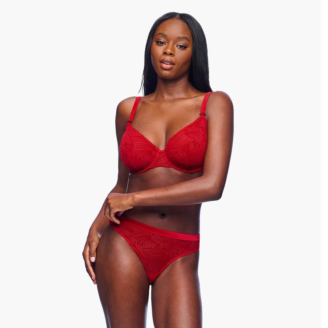 An underwire, unlined Clancy Demi Bra offering optimal support and coverage in sizes up to a G cup, with a sheer everyday design, hook-and-eye back closure, and luxe adjustable velvet straps.