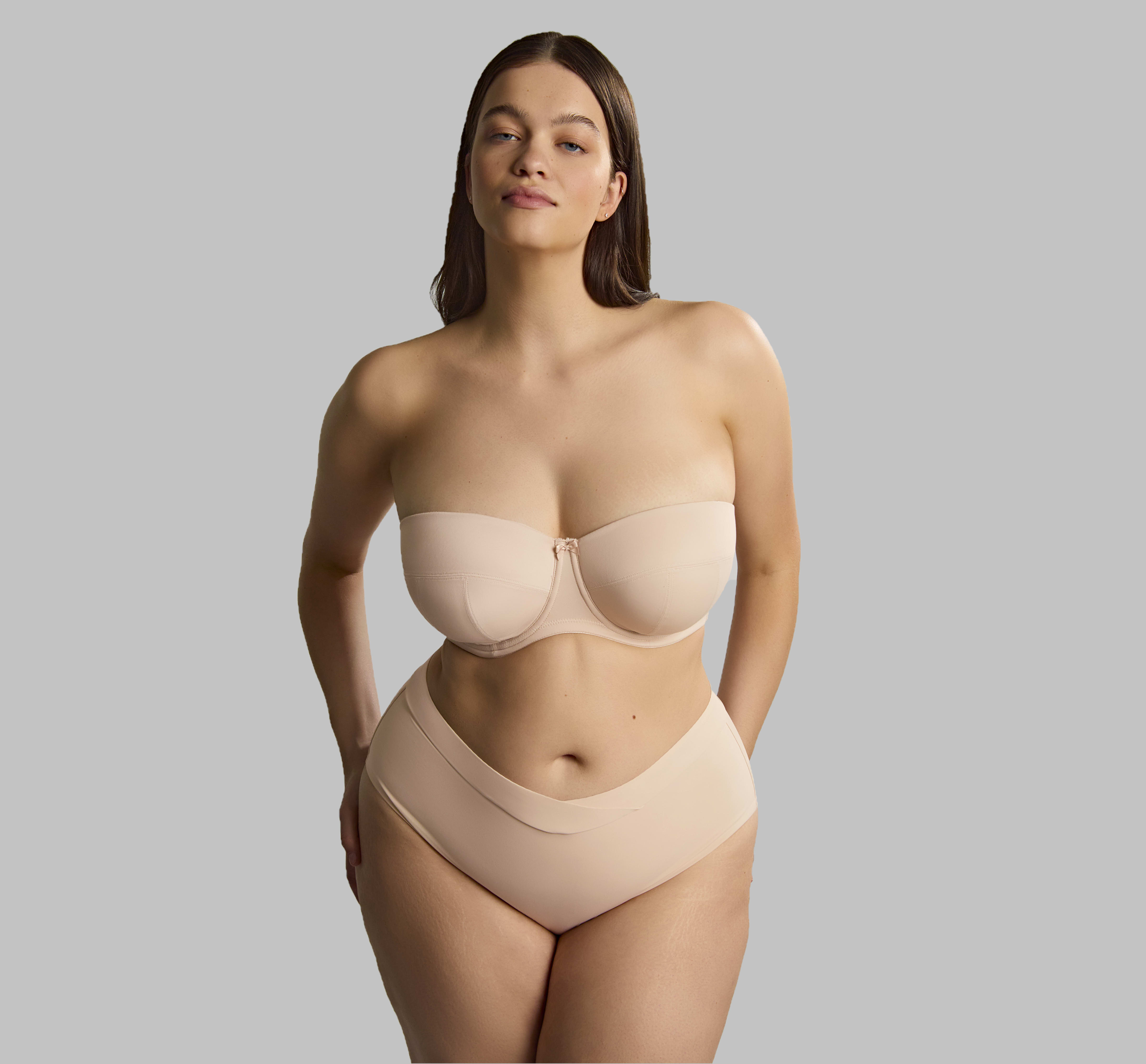 Dana is a fabulous Strapless Bra now available in the Sculptresse range! With slightly shaping wings and a deep hook and eye finish with plastic boning to offer confidence and comfort. Four section padded cut and sew cup shape to provide a supportive and uplifted fit. Styled on a cradle and with double layer slightly shaping wings provide firm and comfortable support around the body.