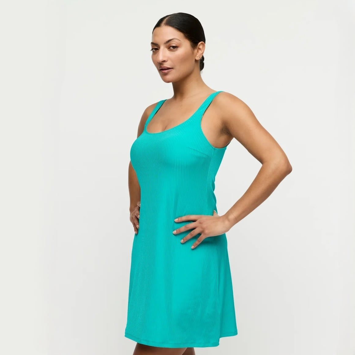Trendy ribbed look with sun-catching details. Short dress ideal for beach outings and holiday sightseeing. On-trend and flattering in green.