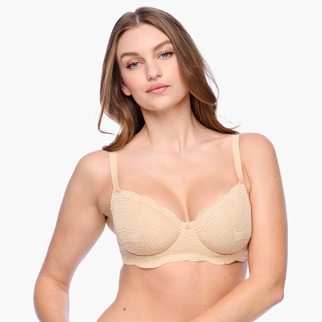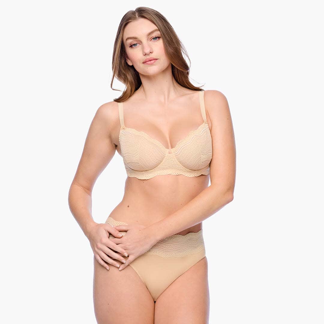 A supportive cotton underwire bra designed for everyday elegance. Features flat lace that sits smoothly under clothing for a sleek, polished look, with invisible tulle lining for added support and lift. The Dolce Balconette Bra is available in sizes up to a G cup for optimal coverage. Finished with a hook-and-eye back closure and adjustable straps. Hand wash in cold water; do not tumble dry.