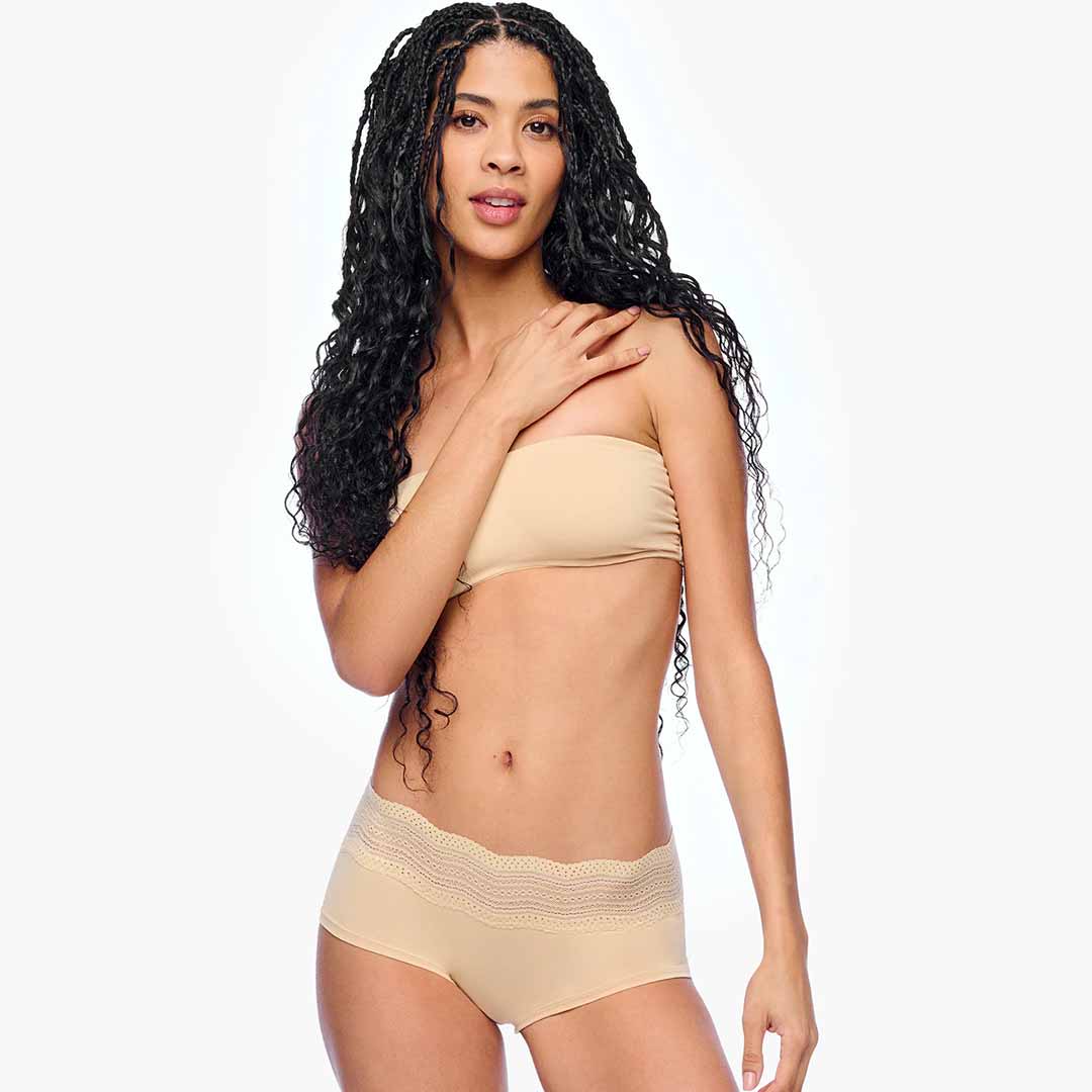 Mid-rise boyshorts crafted from ultra-soft cotton and delicate chevron lace. Dolce Boyshort features a semi-sheer, stretchy lace waistband for a comfortable fit and full rear coverage. Finished with a cotton-lined gusset for added comfort.