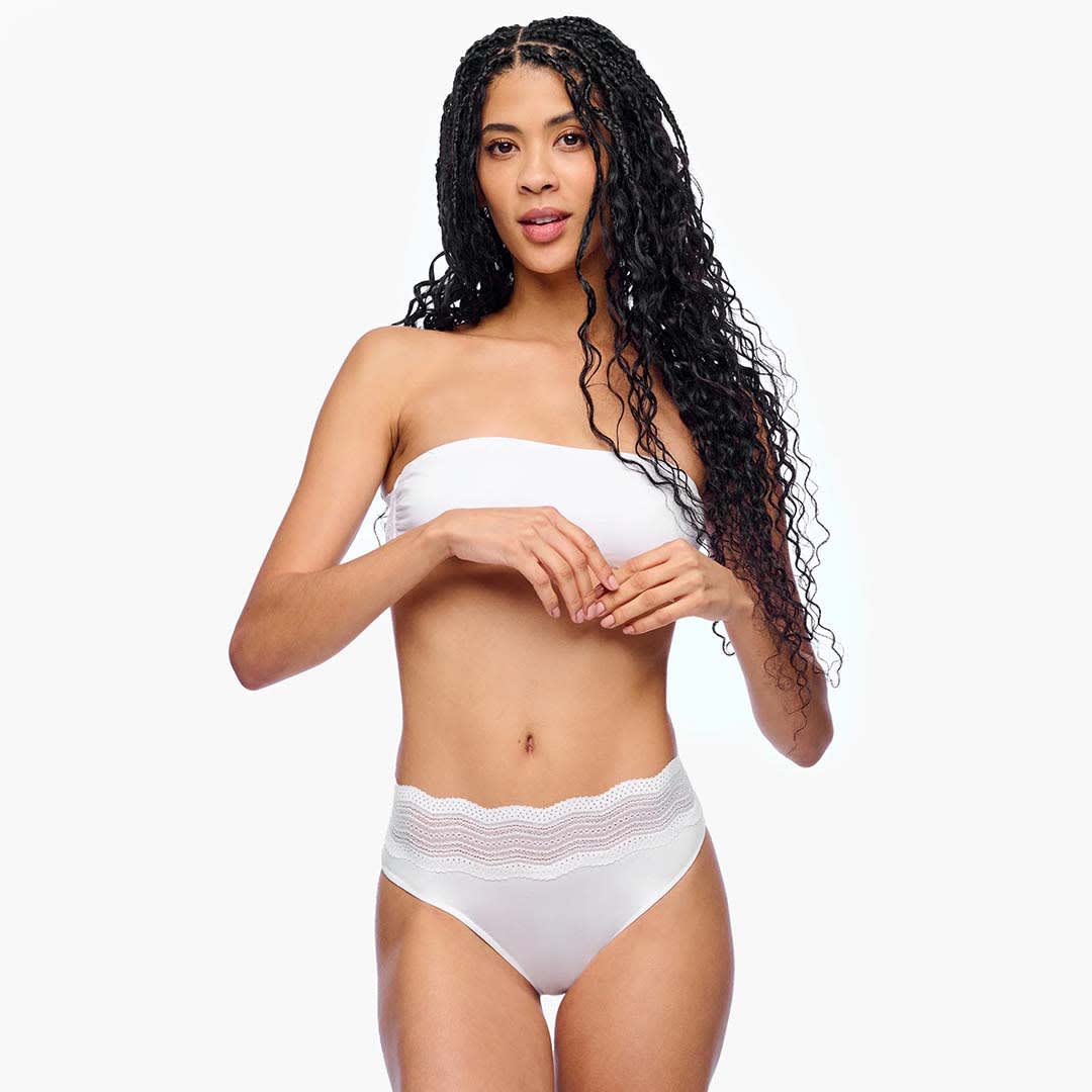 High-rise Dolce bikini crafted from a soft cotton blend with delicate chevron lace. Features a wide, stretchy lace waistband that sits at the belly button for a flattering fit, offering full rear coverage. Finished with a cotton-lined gusset for comfort. Machine wash on a delicate cycle; do not tumble dry.