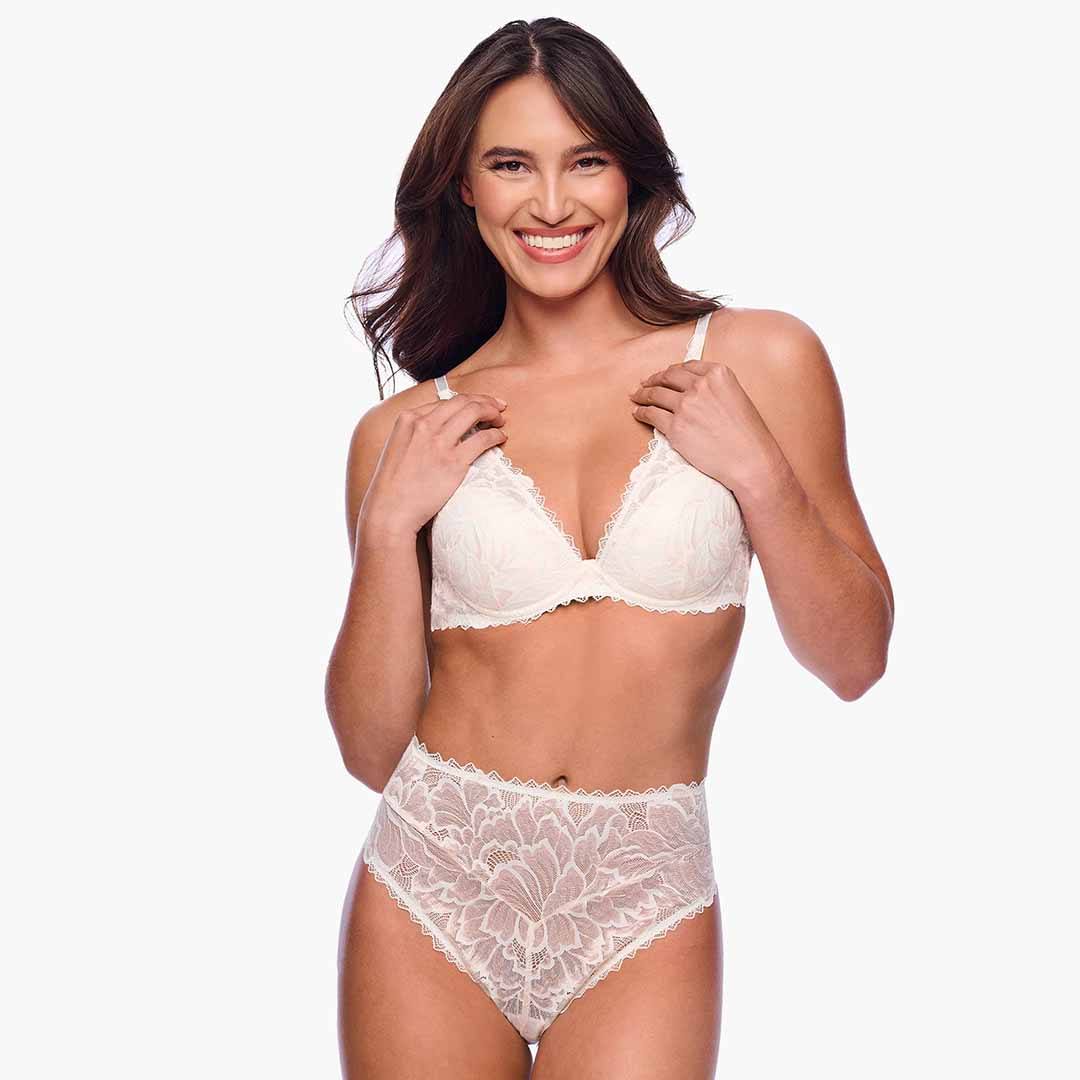 The Encantata High Rise Bikini Brief features geometric lace trim detailing and a high-cut leg designed to flatter and enhance your shape. Offers moderate back coverage with a soft stretch fit for comfort. Finished with a cotton-lined gusset for everyday wear. Hand wash only; do not tumble dry.