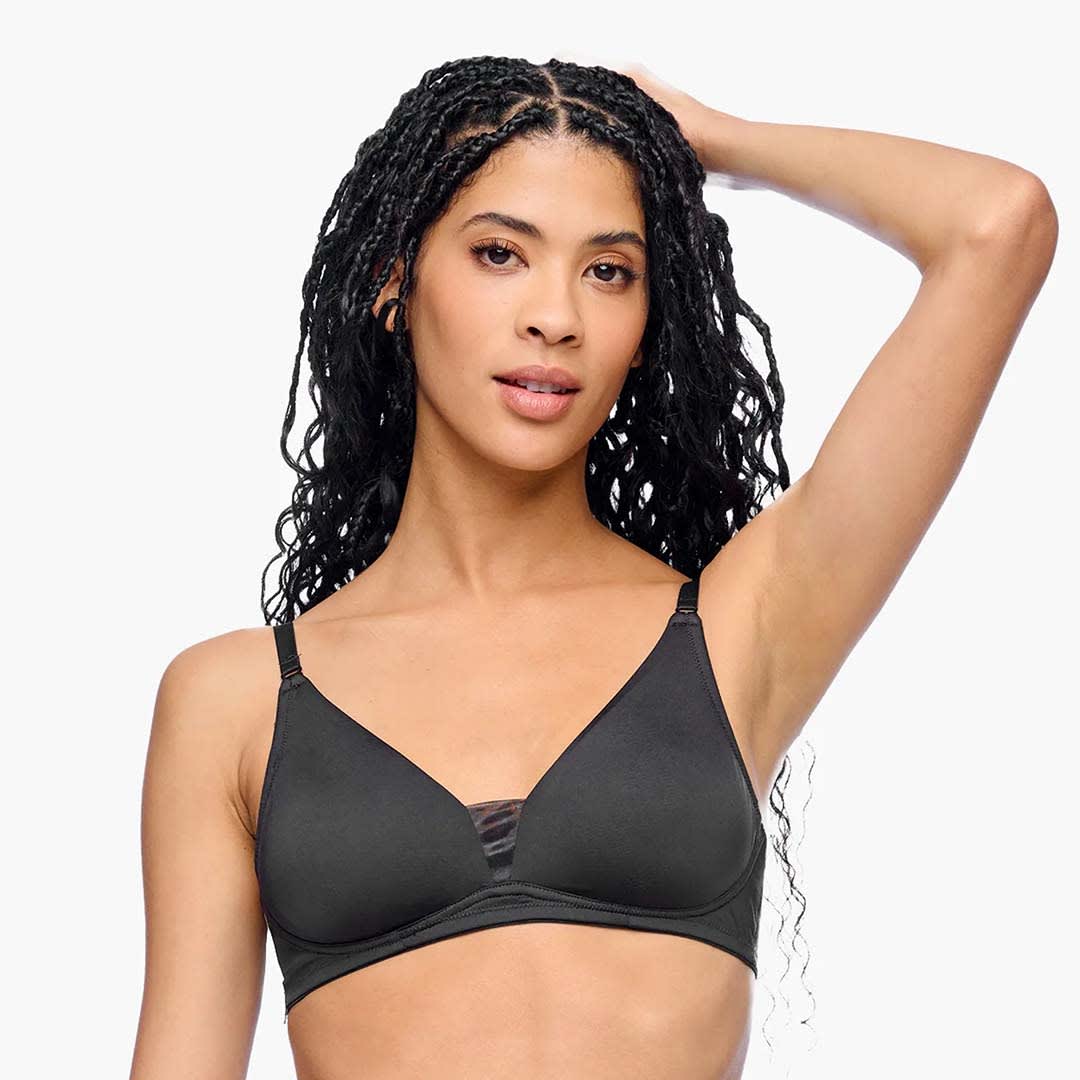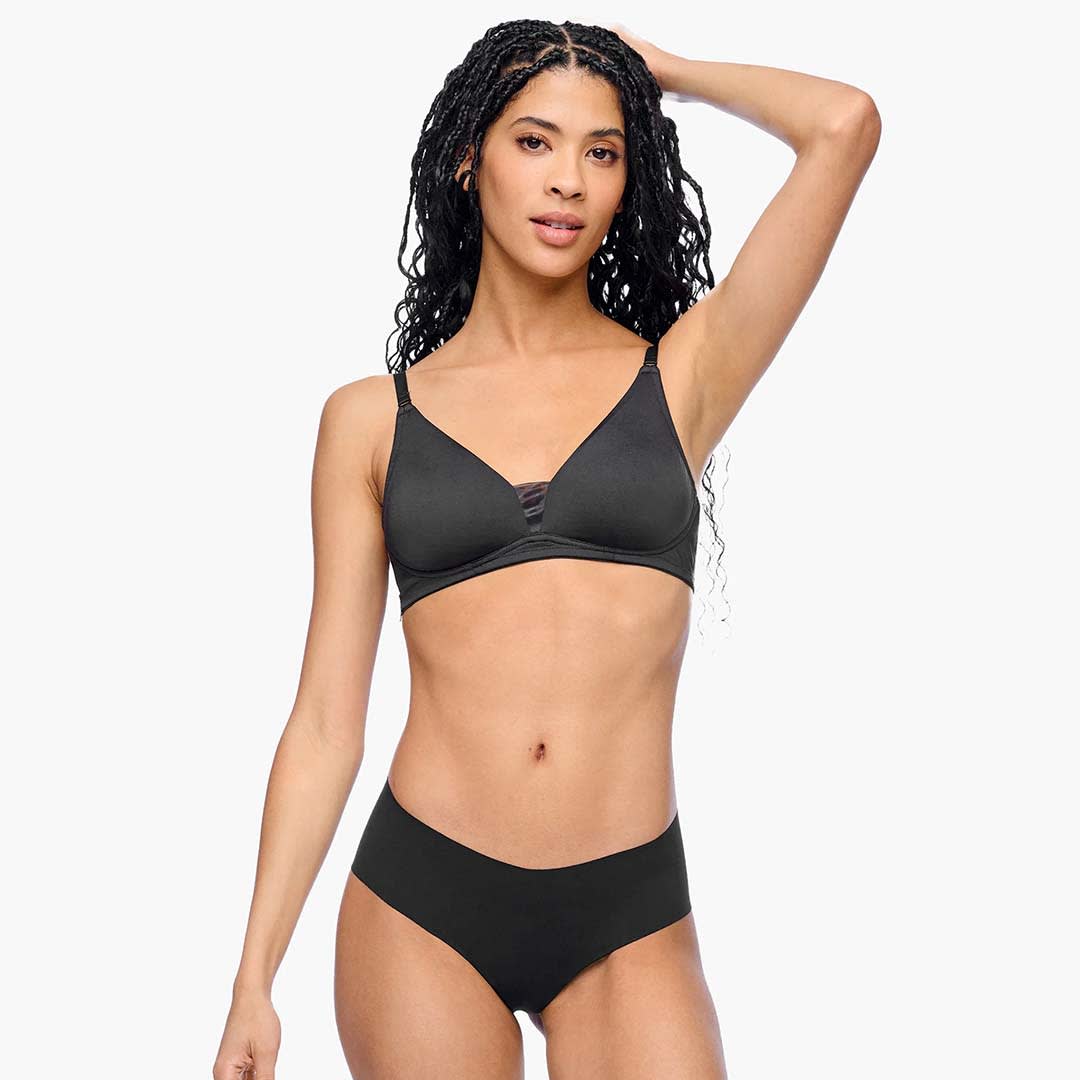 A sleek bralette designed in ultra-soft microfiber for a smooth, second-skin feel. The Evolution Bralette features a U-shaped ballet back that offers light support with all-day comfort, while a delicate sheer panel at the centre front provides subtle coverage between the cups. Finished with adjustable straps and a hook-and-eye back closure. Hand wash in cold water; lay flat to dry.