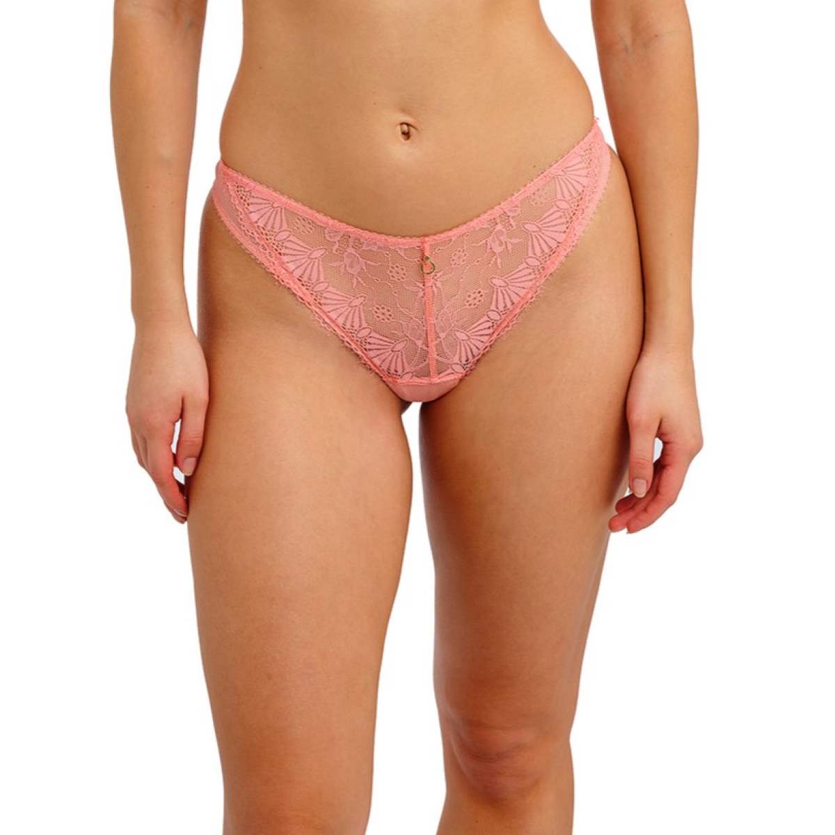 The Fascinate Thong showcases beautiful eyelash edge lace for full front and back 'V' detailing, decorative mesh detailing, and a metallic ring and ribbon detail charm at the center front.