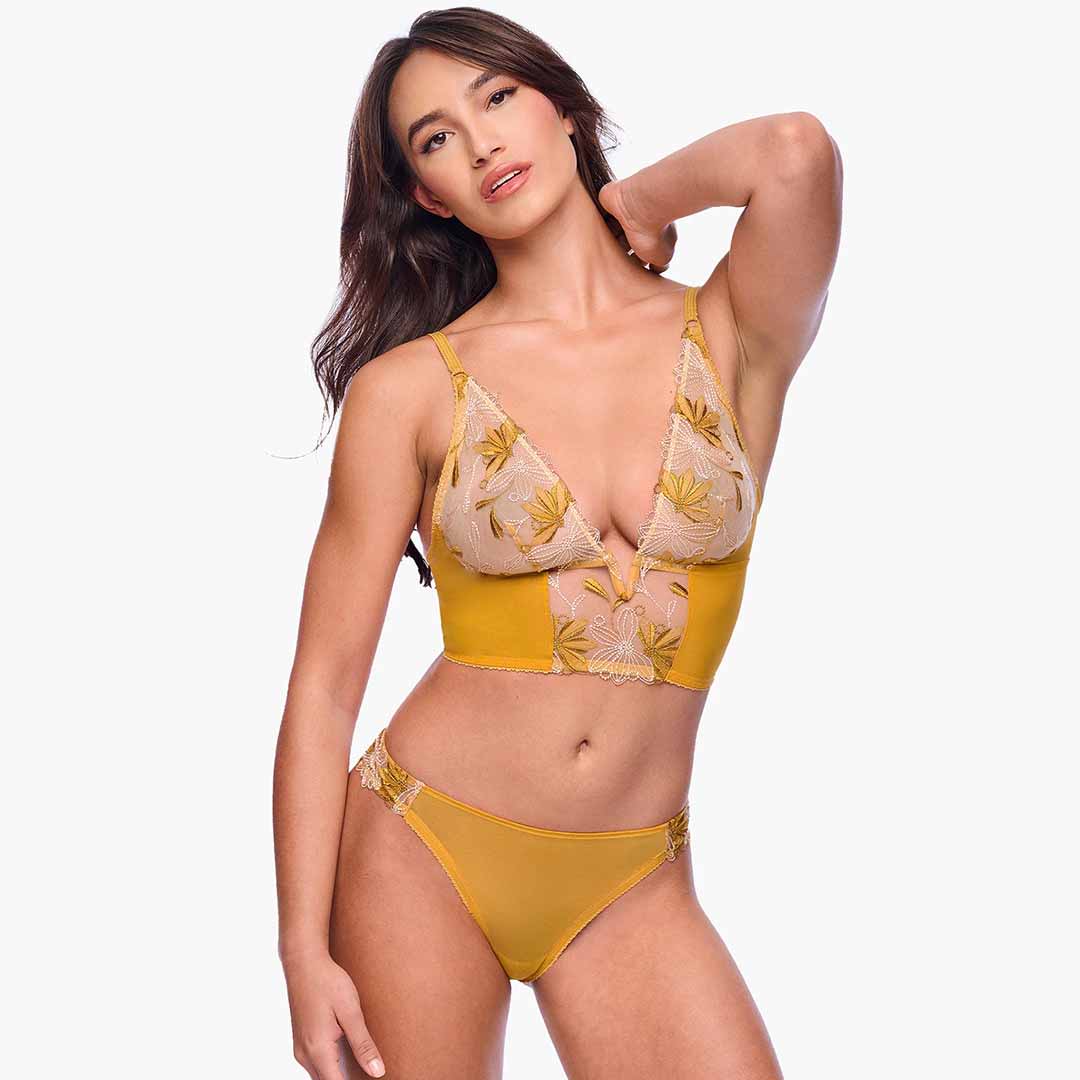 The Fiorita Naughty Bikini Brief is a mid-rise, open-back bikini style crafted from custom French embroidery and mesh with a soft waistband and cotton-lined comfort.