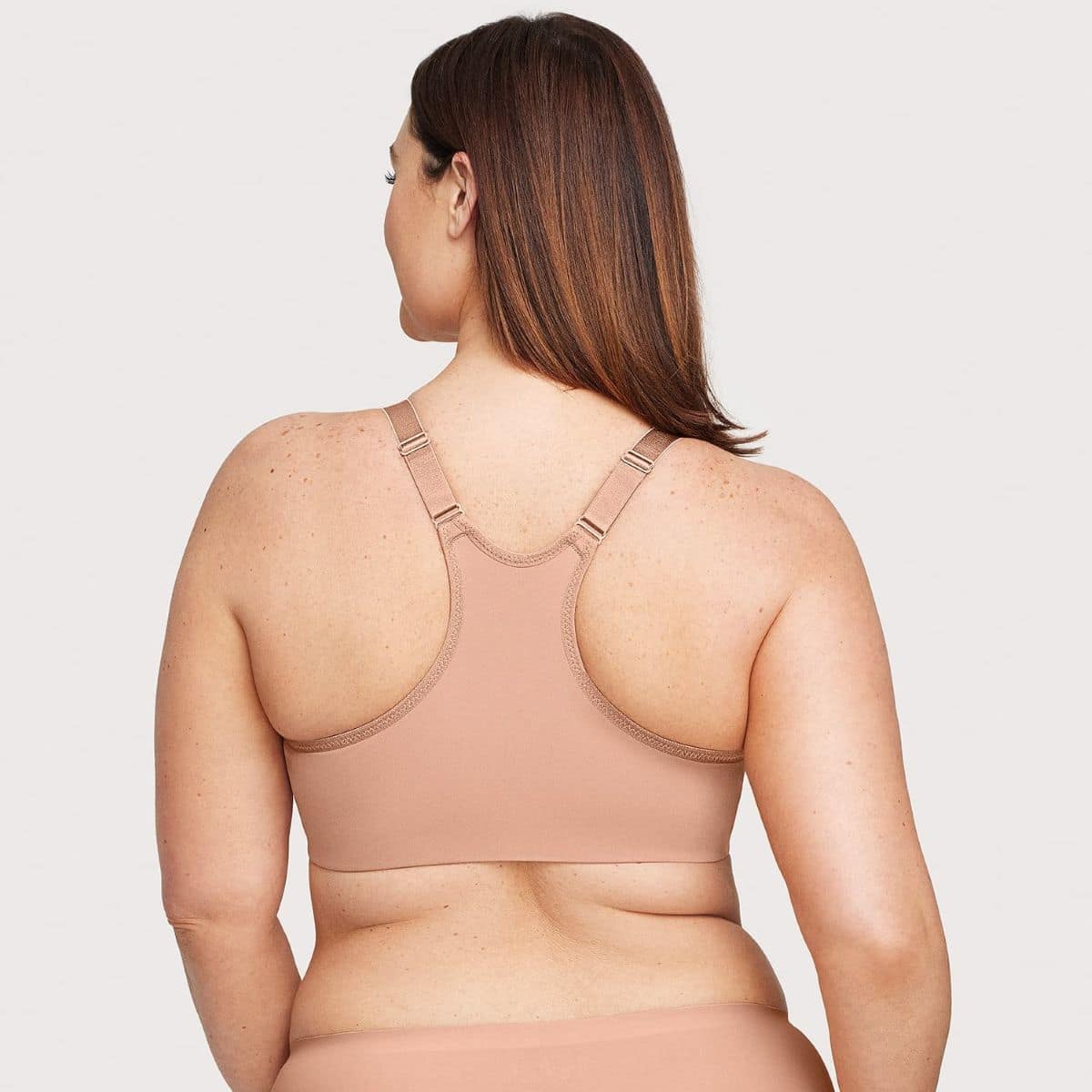 Smoothing high back with stretch fit. Non-slip straps adjust to your fit. Easy on and off secure front closure.