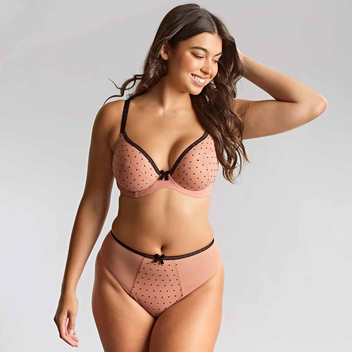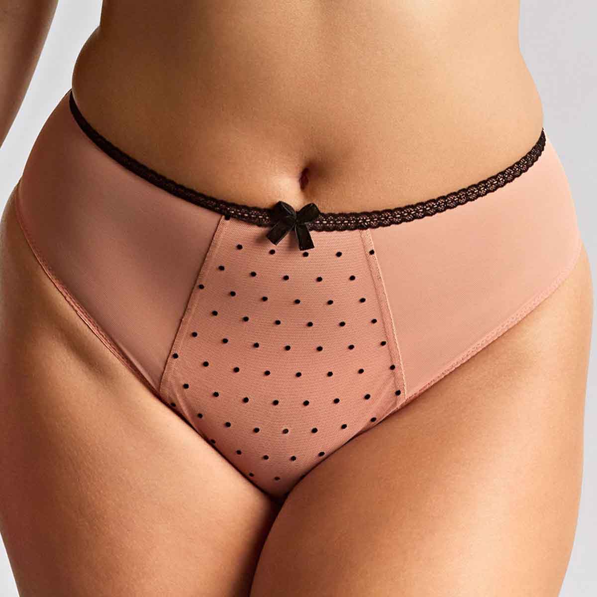 Complete your look with the Gabrielle High Waist Brazilian Brief, designed to flatter with vintage-inspired charm. This elegant brief features playful flocked polka dots, delicate lace trims, and a chic pink and black palette, blending retro allure with modern femininity. It's the perfect way to add a stylish touch to your lingerie drawer this season.