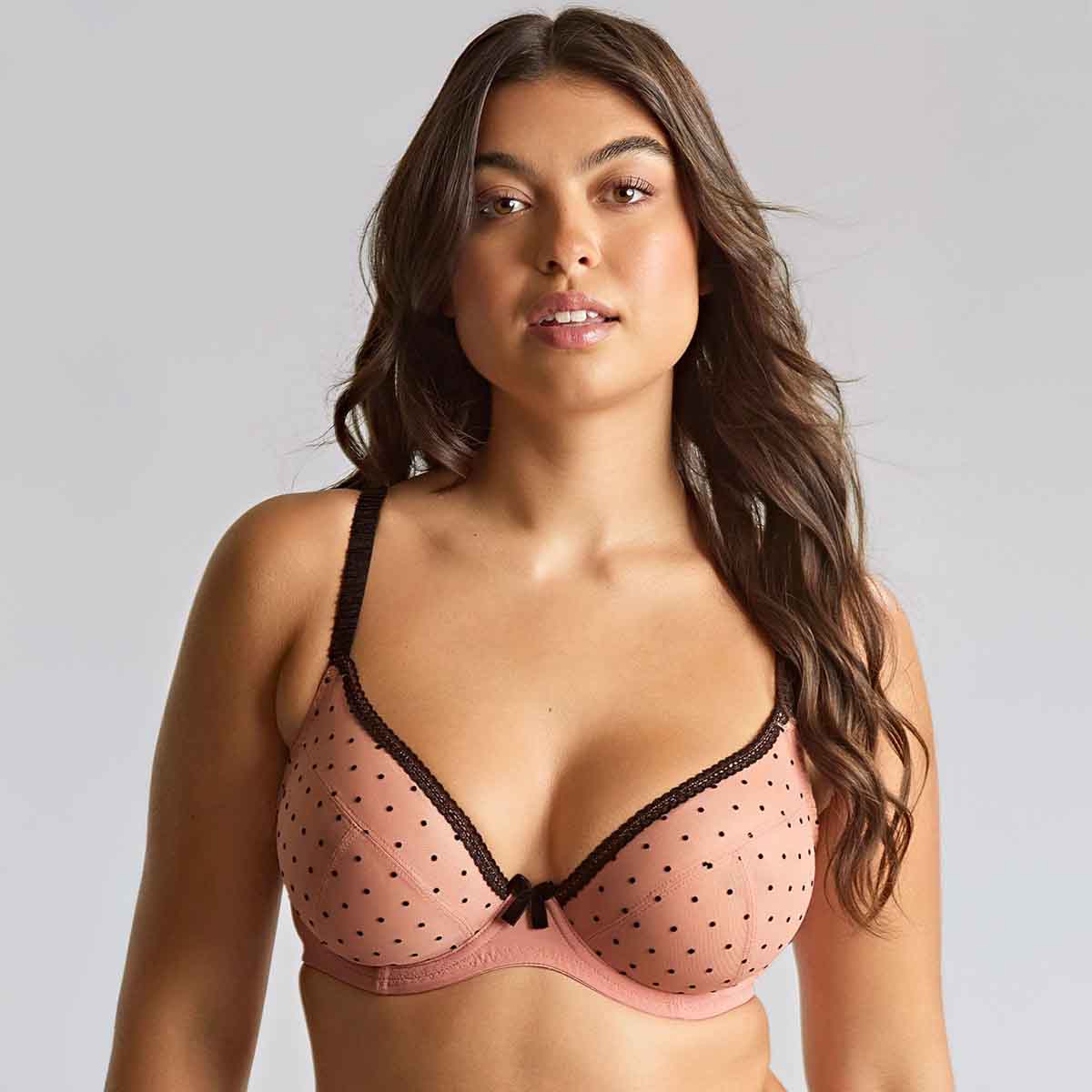 Crafted with expert precision, the Gabrielle Plunge Bra exudes both charm and sophistication, adorned with playful flocked polka dots and finished with delicate lace trims. The bra's rigid tulle cups blend support and projection for an enhanced shape without compromising on style. A low center front creates a flattering, plunging neckline, ideal for low-cut clothing, while playful bow details add a charming and feminine touch. Gabrielle is irresistibly elegant, offering a perfect blend of vintage-inspired allure and modern femininity, an essential addition to your lingerie collection this season