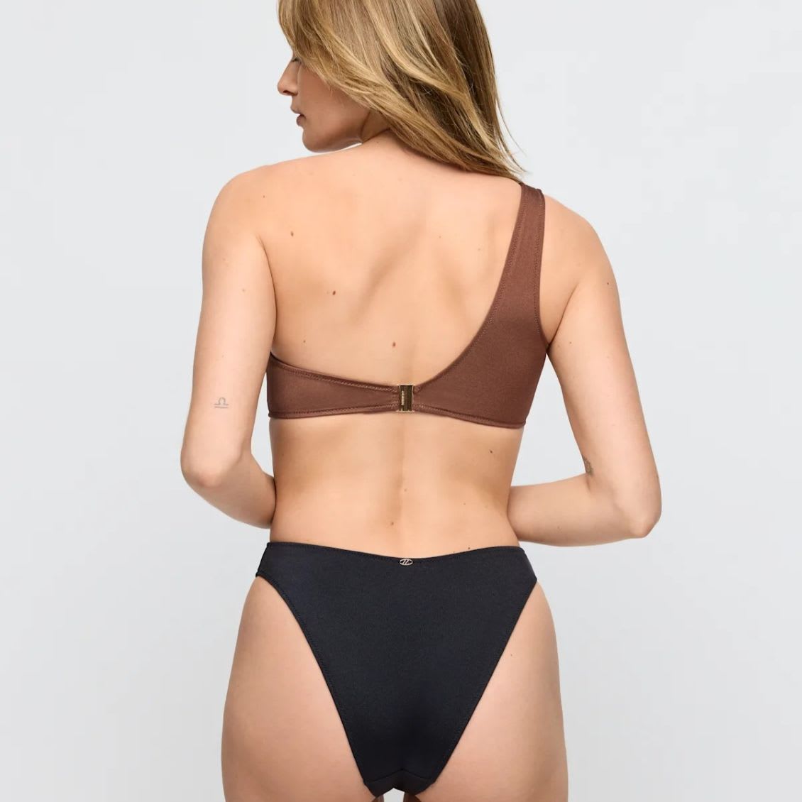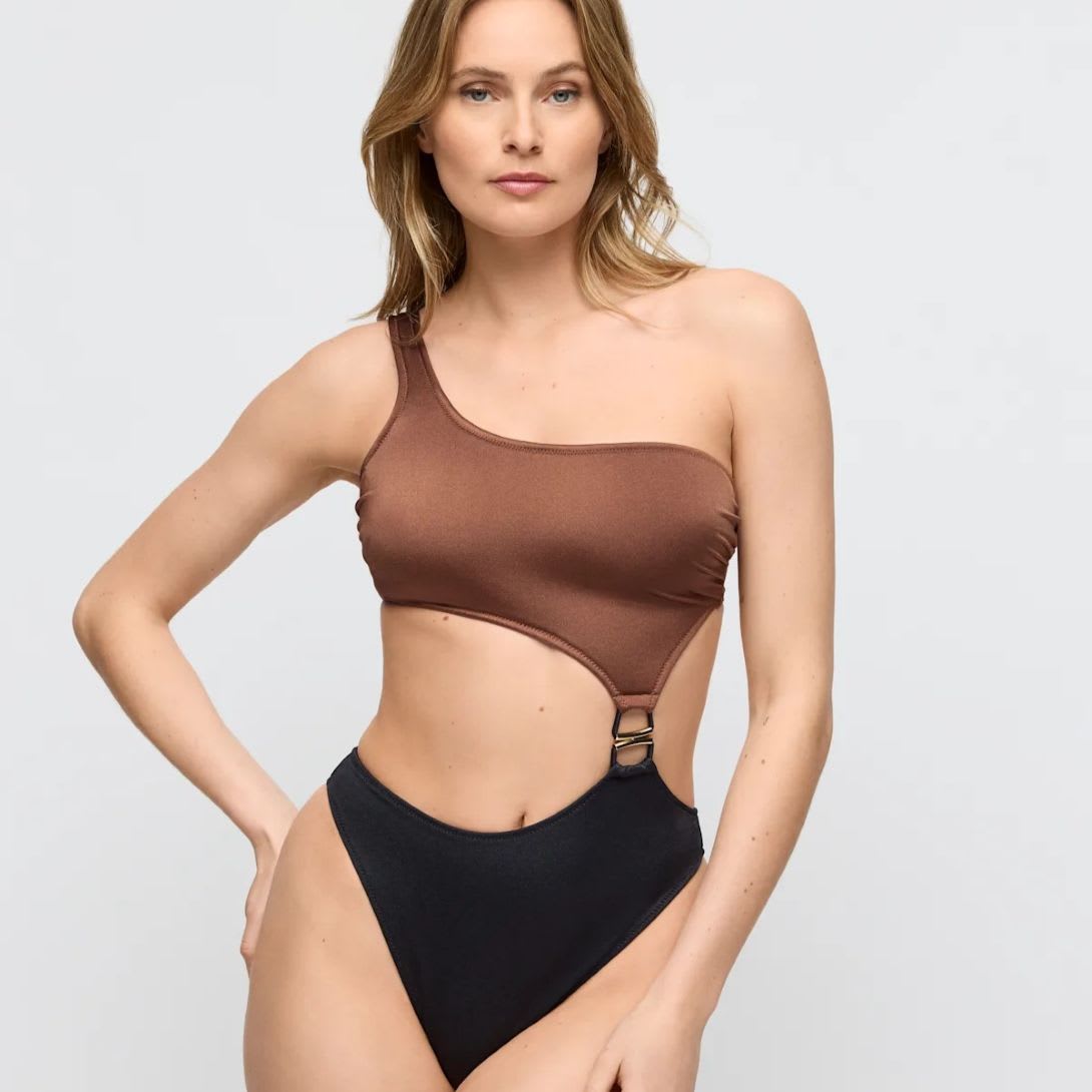 This asymmetrical swimsuit with cut-outs makes a stylish fashion statement.