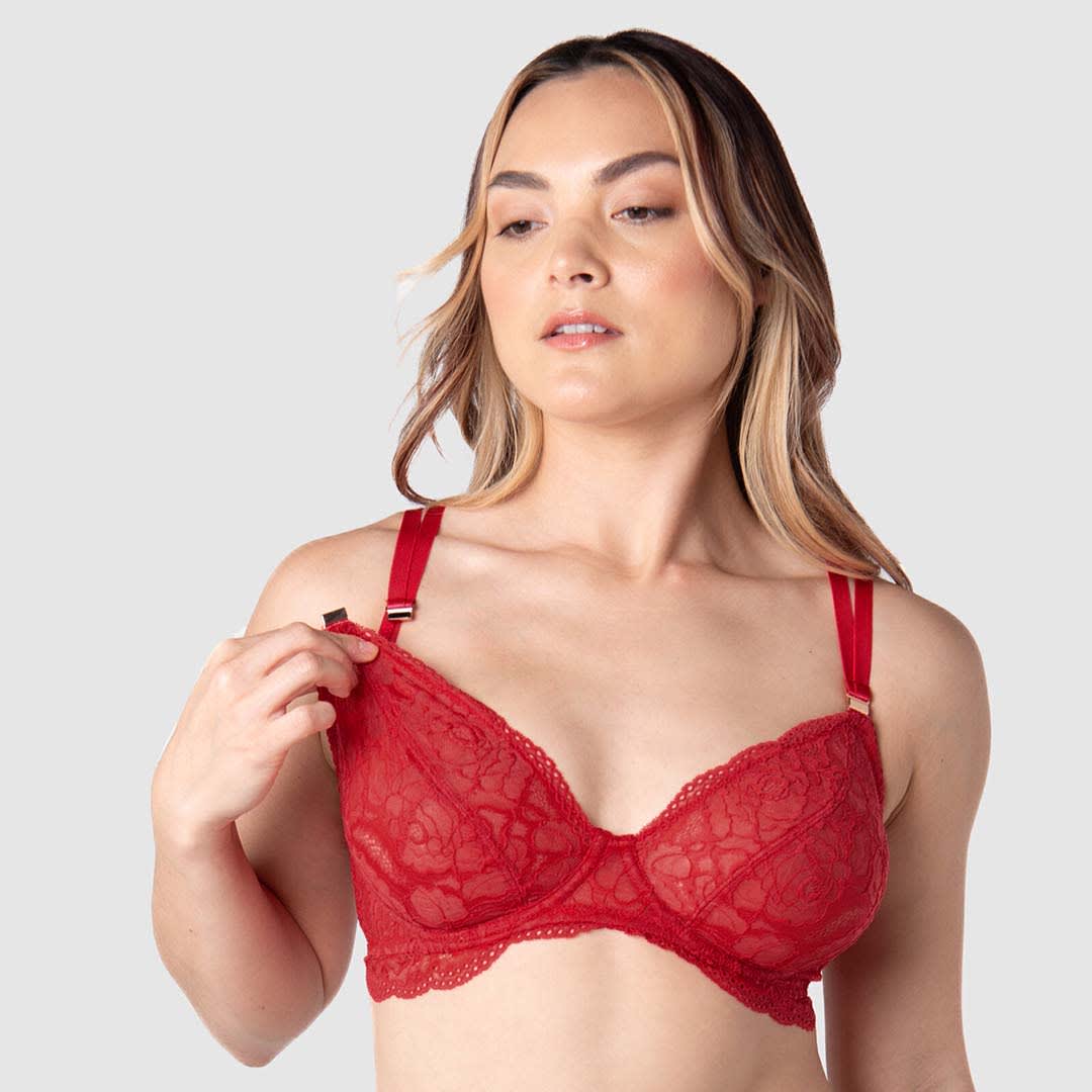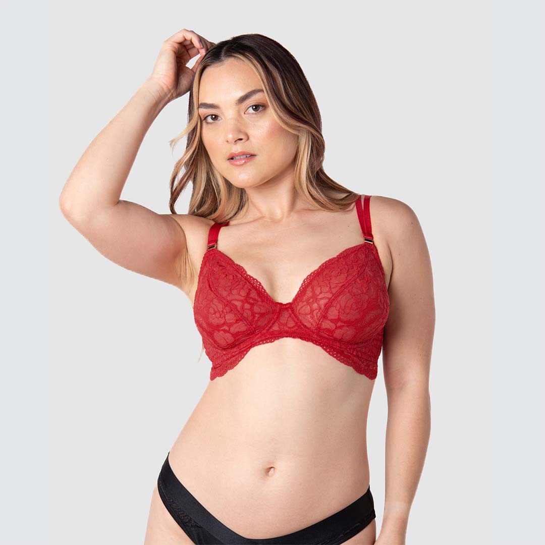 Heroine Plunge Bra with fine twin straps and flex wire support. Soft scalloped lace with sheer mesh lining drops down to a cotton side sling. Plunging yet supportive shape, perfect for pregnancy, breastfeeding, and beyond.
