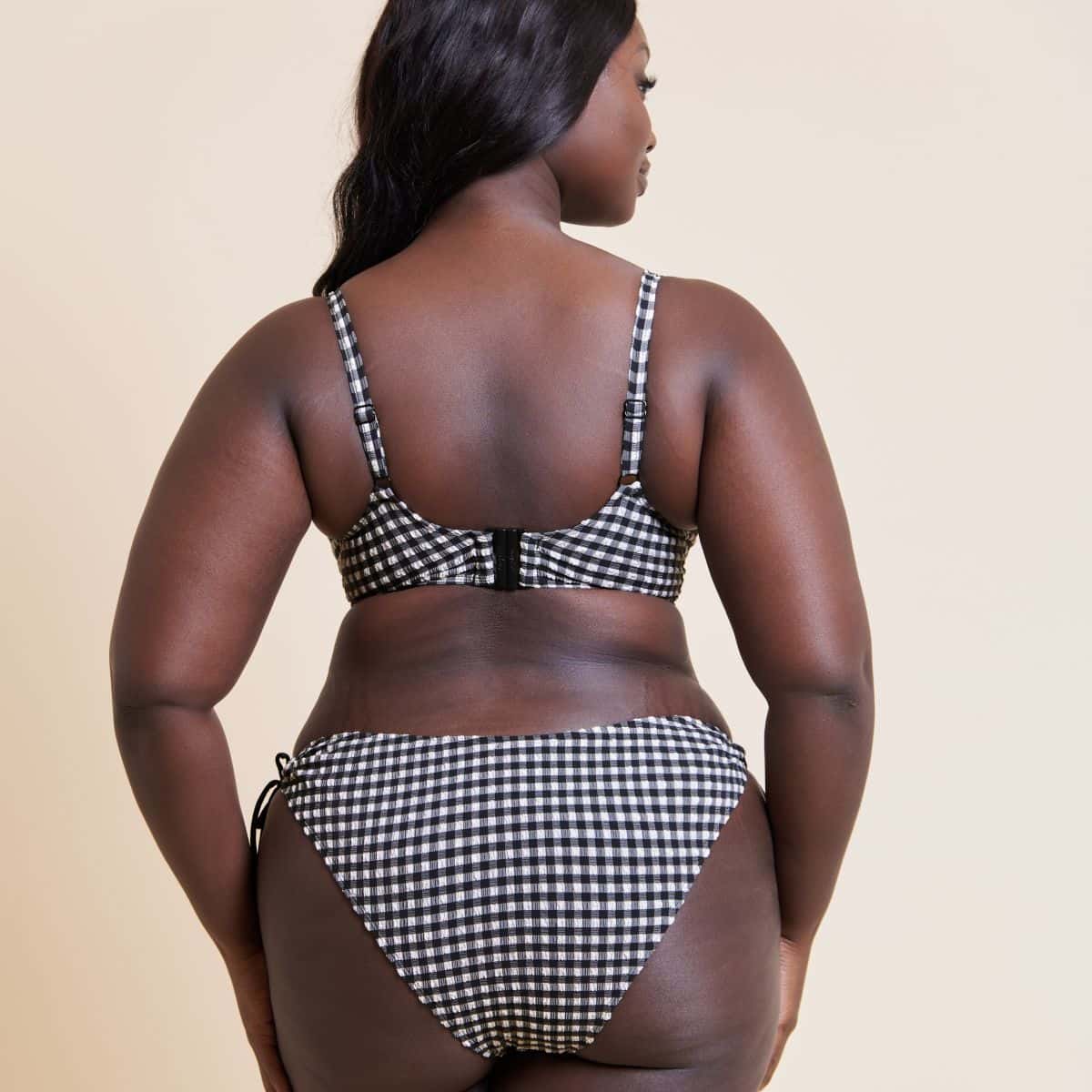 A dry-touch crinkled gingham swim fabric. Non-padded underwired scooped balcony bikini with stretch fit cups and cute tie detail.
