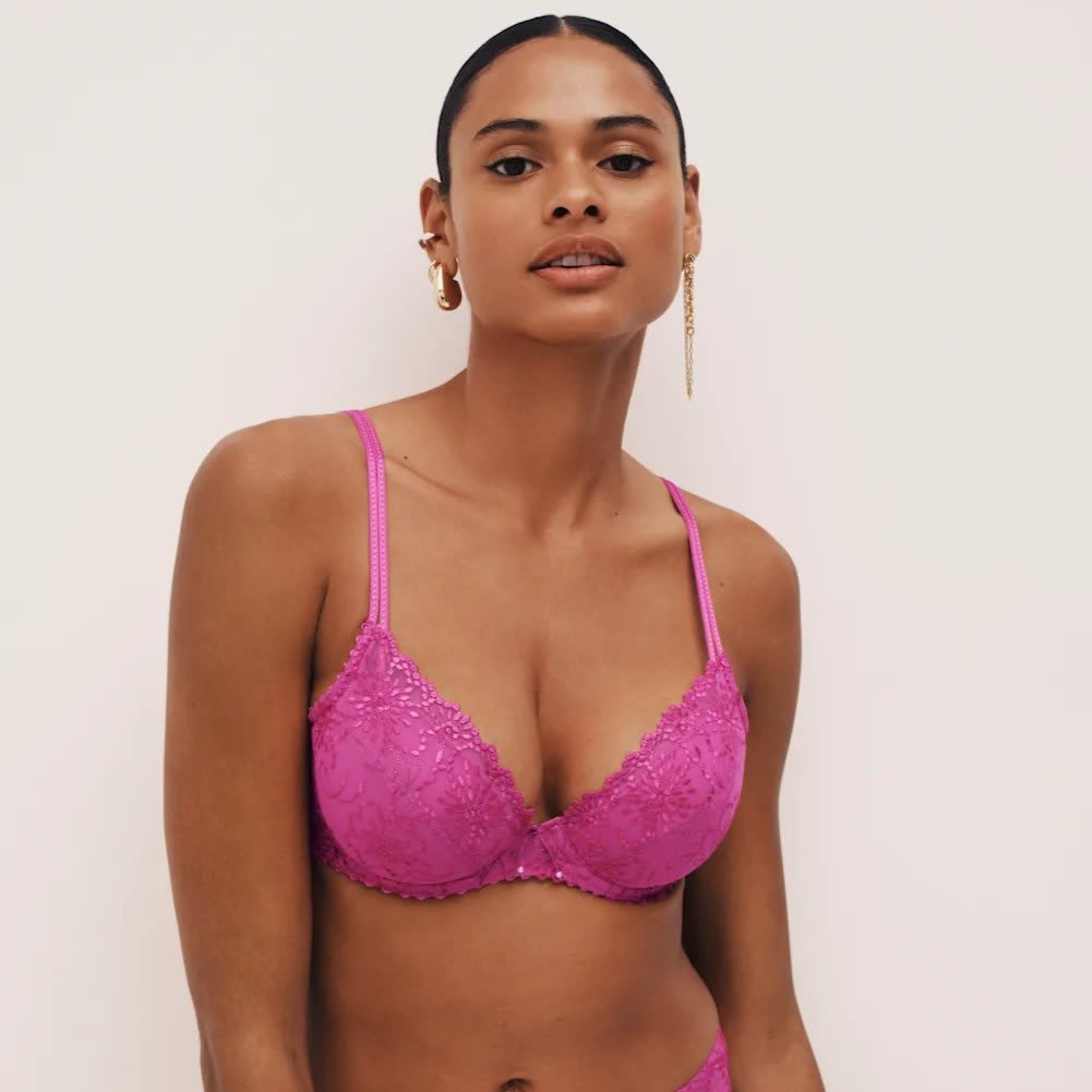 The Jane lingerie collection by Marie Jo offers a perfect blend of style and comfort for all-day wear. Indulge in luxury with this elegant push-up bra adorned with intricate floral embroidered cups. The push-up padding enhances volume and creates a flattering uplifted cleavage effect. With split spaghetti shoulder straps and a semi-sheer tulle back, this bra adds a subtle flirty finish to your look. The underwire provides additional support and structure. Coordinate your lingerie look by pairing this push-up bra with matching pieces from the Jane collection by Marie Jo.