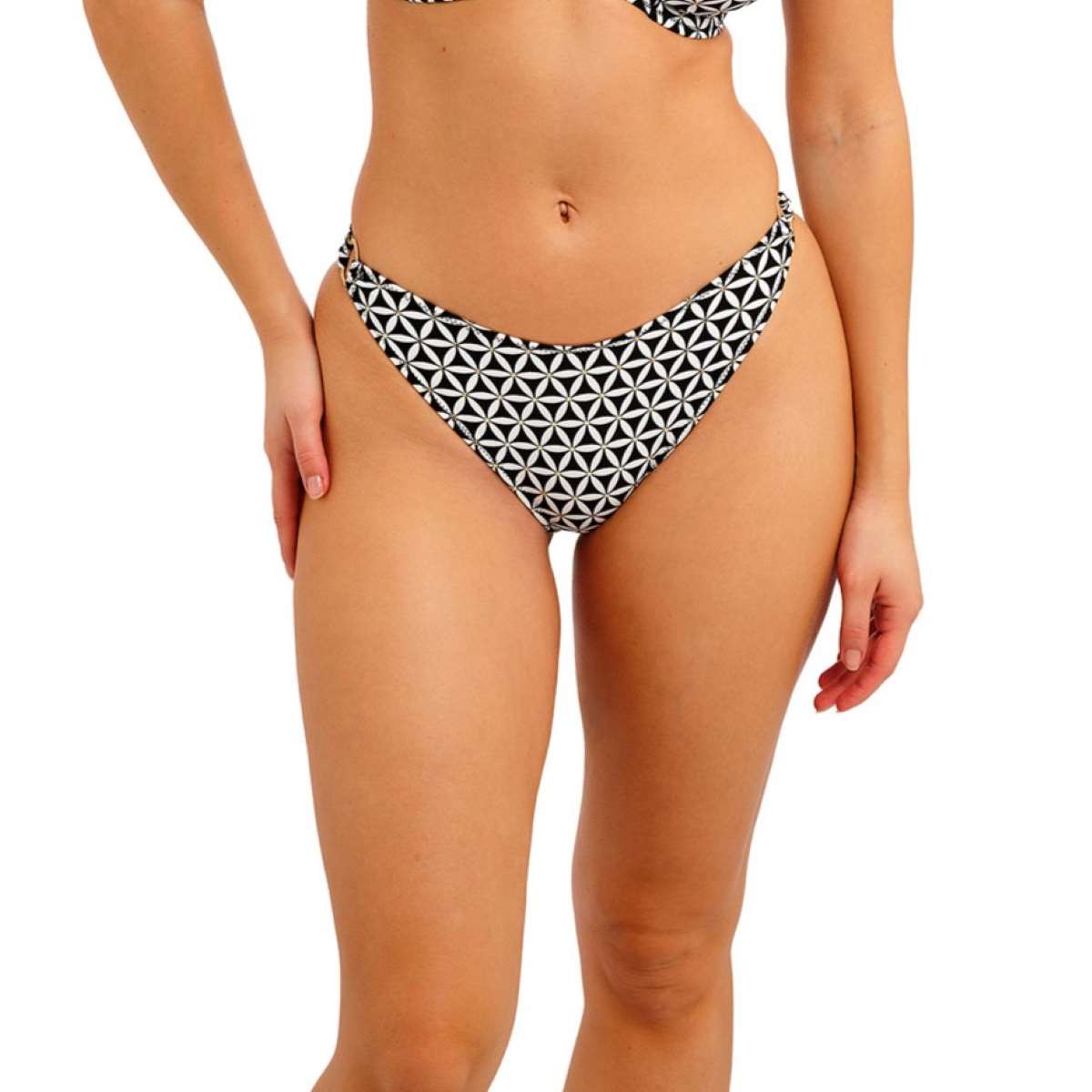Sits high on the hips with a higher scoop leg line for a flattering, minimal-coverage fit, this piece features a skimpy bottom for a cheeky silhouette. The fabric base is adorned with decorative gold-coloured foil-style detailing, complemented by luxurious gold ring accents for a chic, modern finish.