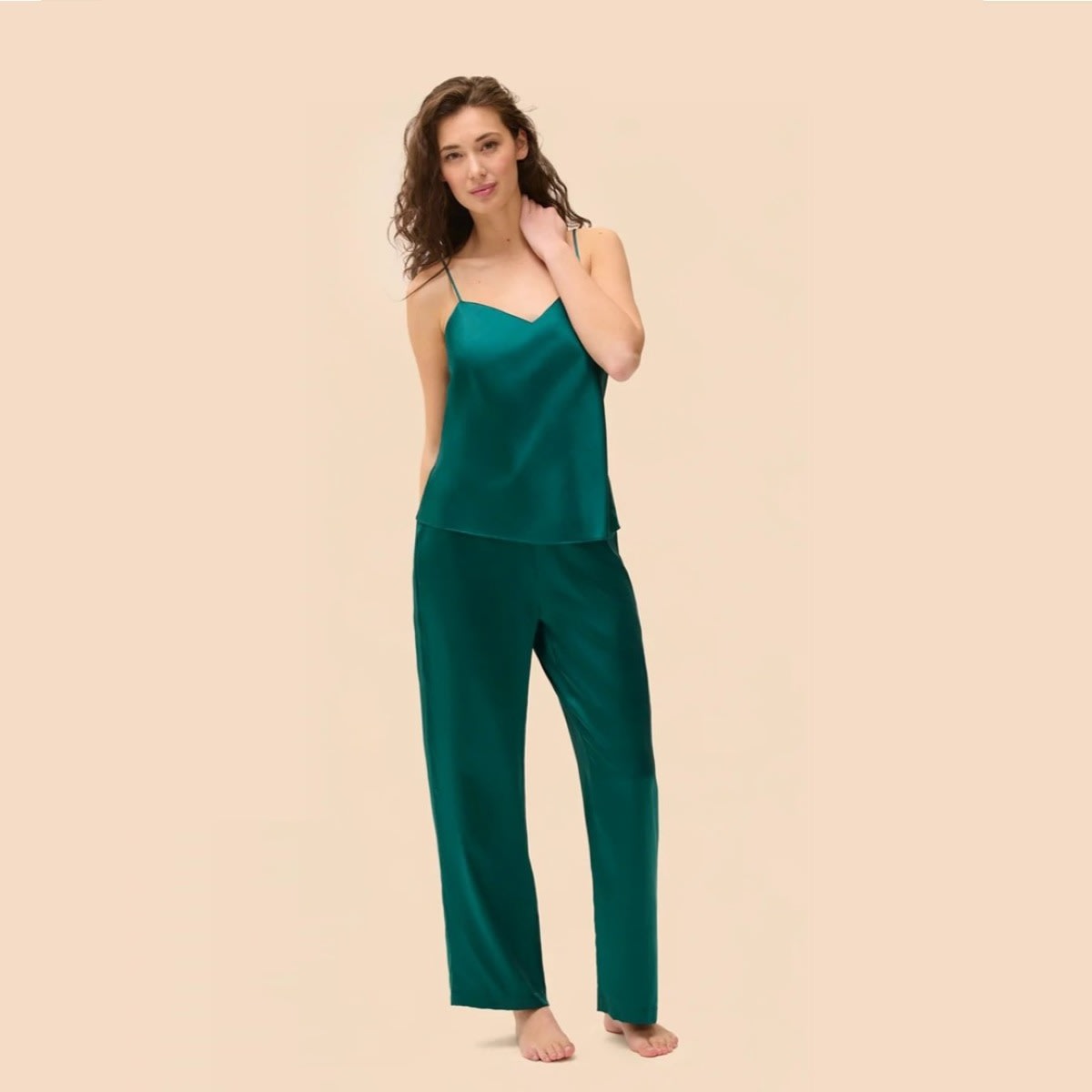 Camisole crafted with 100% silk. Slight flared cut that for a relaxed, flattering fit. V-neckline with a straight back. Slim, adjustable silk straps. Fine hem finishes.