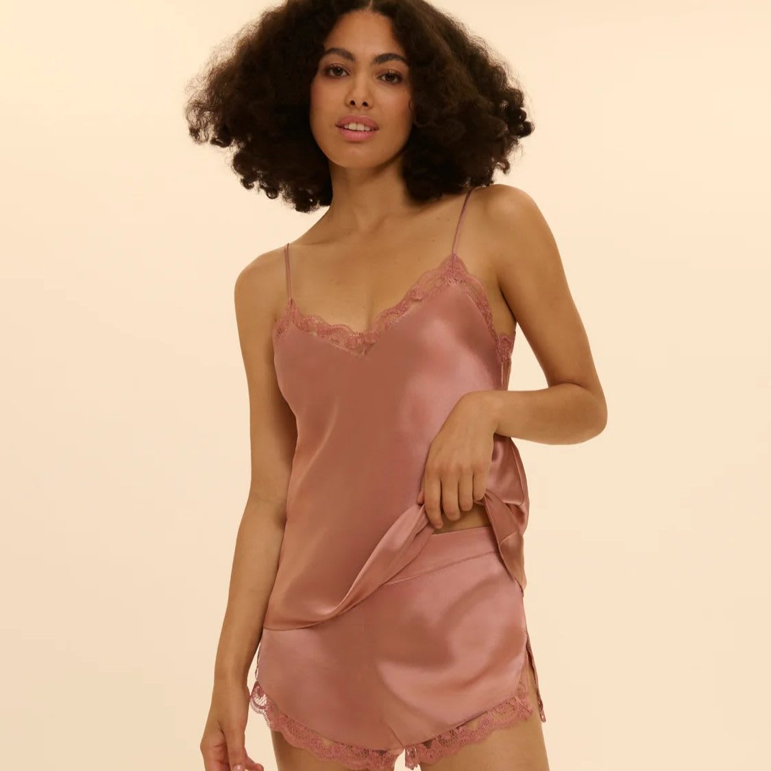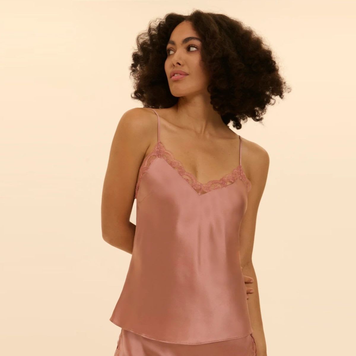 Camisole crafted 100% silk with fine lace accents. Embroidered lace V-neckline in front and back. Slightly flared cut for a flattering fit. Slim, adjustable silk straps.