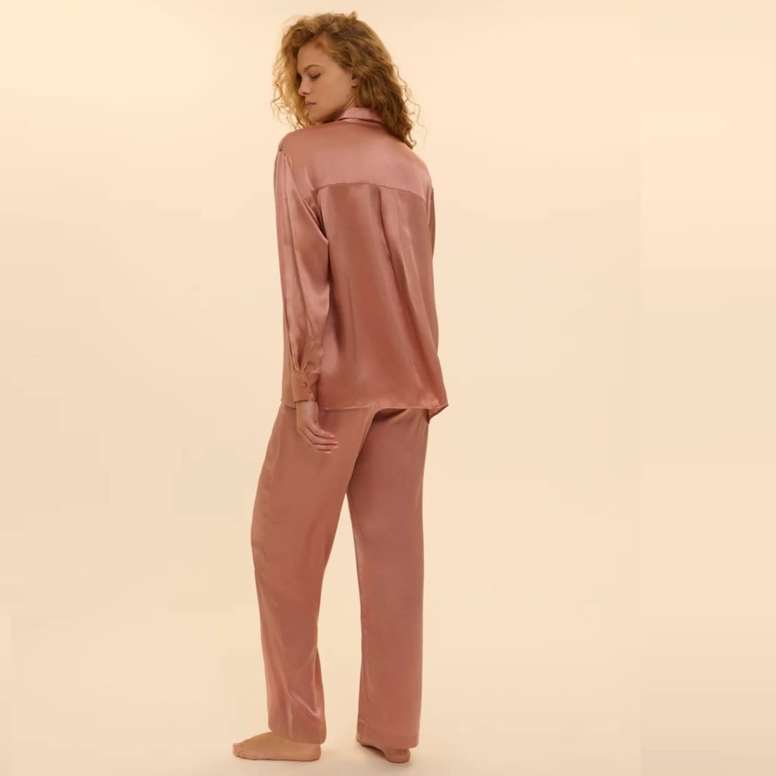 Night pant crafted with 100% silk. Flat waistband at front; wide, gathered elastic at the back. Straight-cut for a streamlined look. Wide hem and straight-cut leg.
