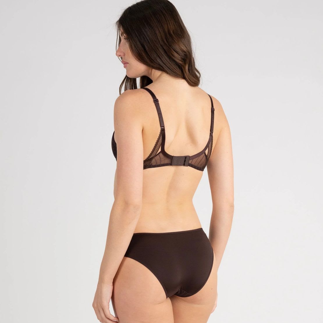 A seductive bra, which reveals a plunging and sensual cleavage. A bra with thin cups covered with floral and delicate lace, a seductive back all in striped tulle playing with lace.