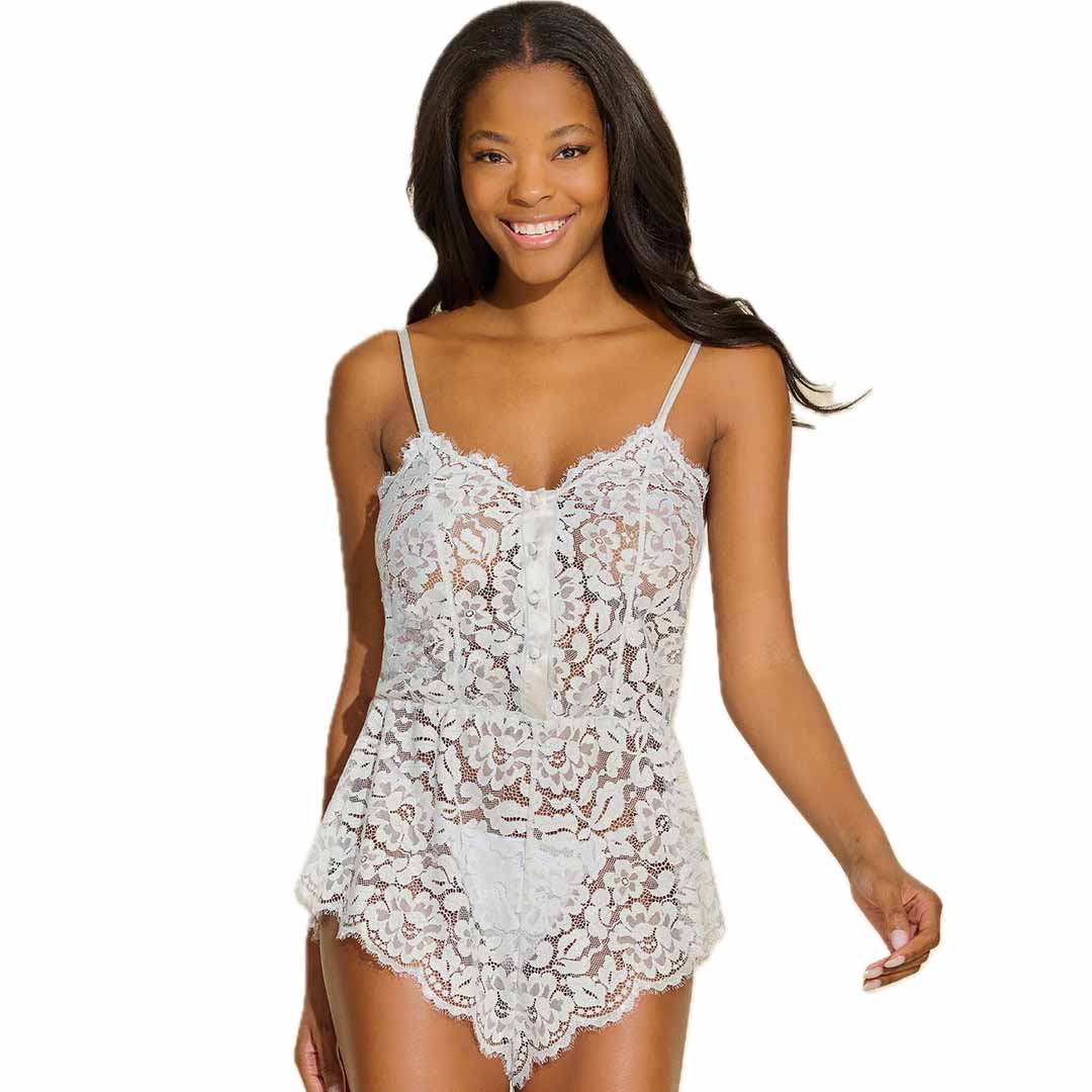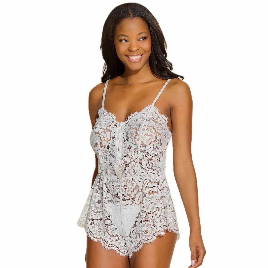 Indulge in luxury with this semi-sheer lace Magnolia Romper crafted from romantic, scalloped, floral eyelash lace and finished with elegant satin trim. The sweetheart neckline features delicate pearl buttons and a satin accent at the front, adding a touch of vintage charm. Designed in a short, cheeky fit with moderate rear coverage, it offers a flattering, feminine silhouette. Complete with adjustable satin straps for a perfect fit. Care: Hand wash only. Do not tumble dry.