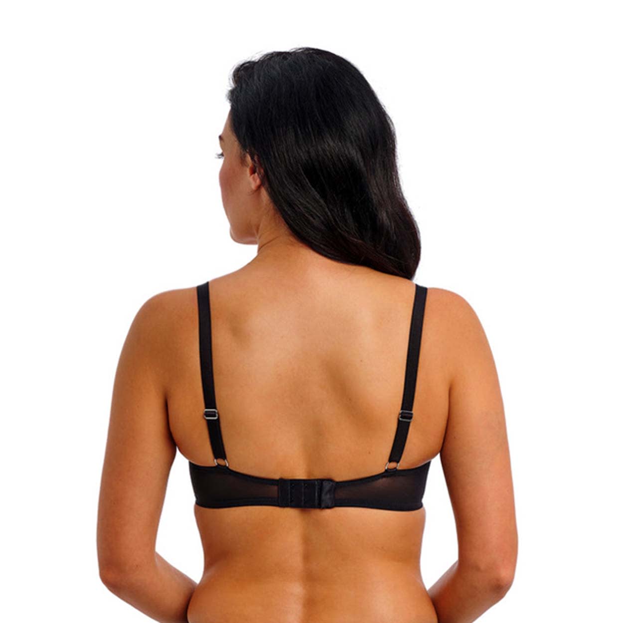 The Mayumi Plunge Bra is designed with a plunging neckline and high apex embroidery outer cups for a beautiful and bold look. The cups feature multi-tonal blue geometric embroidery with a sheen finish on a black tulle net base. Ultra-soft and light push-up pads provide cleavage, uplift, and dimension, while a V-style center front in tulle adds to the elegant design. The wings are made from powernet for support and comfort, and plain plush elastics at the underarm and underband provide a tailored finish. The front strap features embroidered detail overlaid onto the strap elastic. This bra also has fully adjustable stretch straps, a soft-touch hook and eye adjustment, and a contemporary charm detail at the center front.