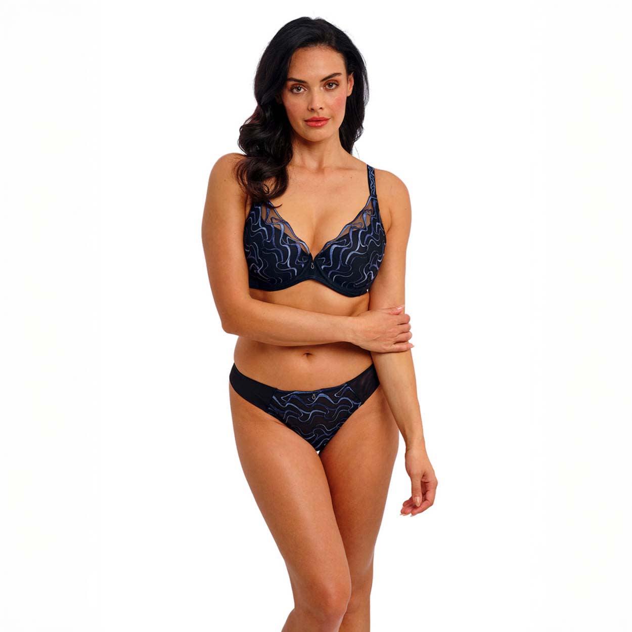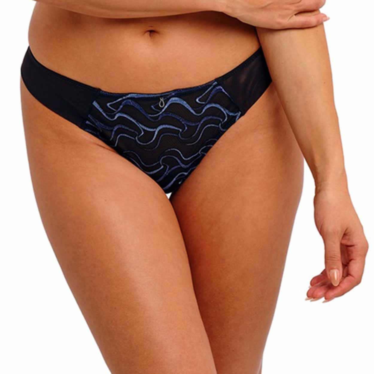 The Mayumi Tanga is a low-rise style with minimal back coverage. The front panel features multi-tonal blue geometric embroidery with a sheen finish on a black tulle net base. A scallop edge of the embroidery at the front waist panel is lined for modesty. Plain plush elastics at the waist and thong back leg edges ensure a tailored finish, while the two-ply stretch mesh at the thong back provides stretch and comfort. Lightweight mesh fold-over at the side legs gives a seamless finish, and a contemporary charm detail at the center front completes the look.