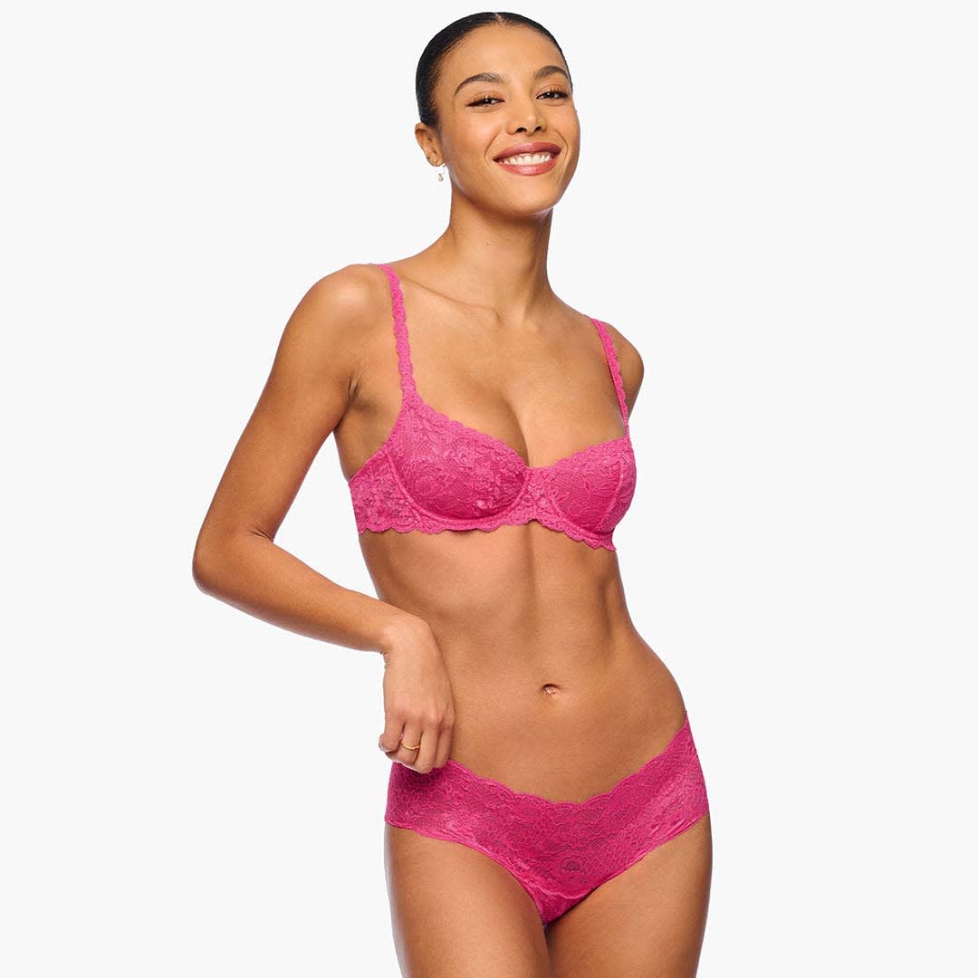 Never Say Never is loved for its beautiful floral pattern and innovative sooth, scalloped lace that lays flat and won't roll. Crafted in Italy with the highest quality materials. It has a soft, comfortable, wide waistband that won't dig.