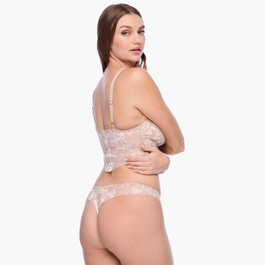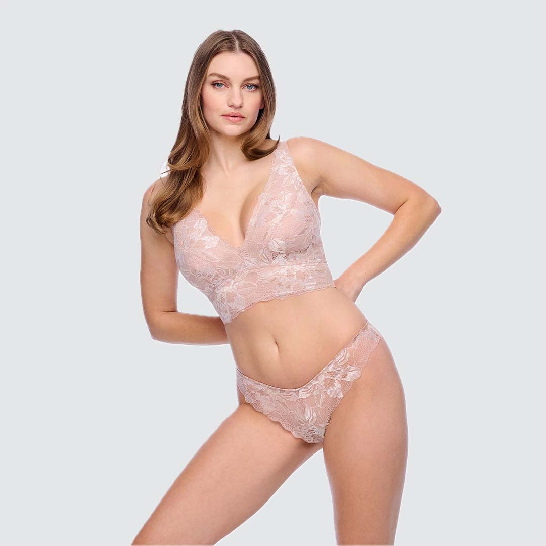 The Paradiso Thong is a mid-rise thong crafted from semi-sheer tricolour lace with a delicate scalloped edge. Designed for a flattering fit with minimal rear coverage and a soft, cotton-lined gusset for comfort. Hand wash only; do not tumble dry.