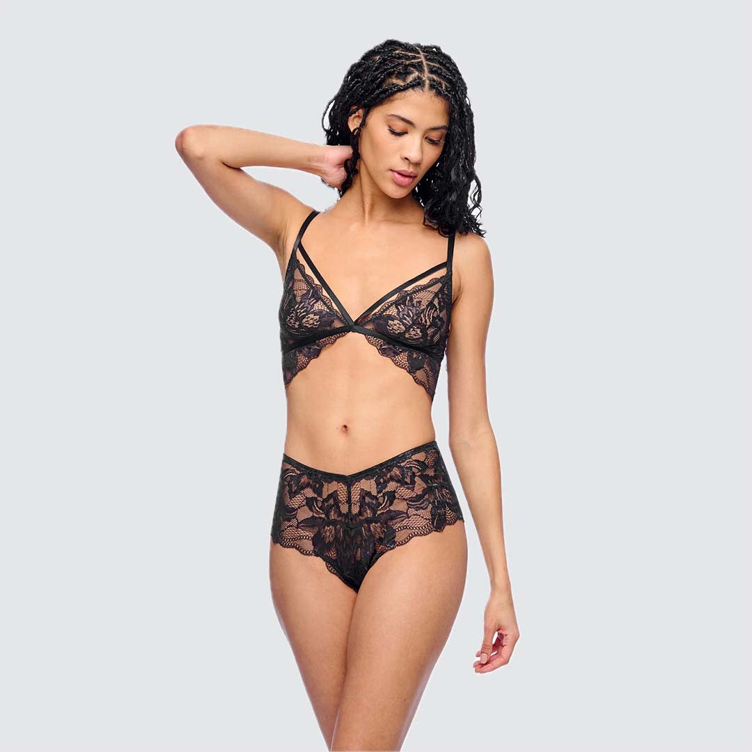 This wireless Paradiso triangle bralette is designed as a chic fashion layering piece, combining comfort with delicate style. It features semi-sheer tricolor lace with a beautifully scalloped edge, creating a soft and feminine look. The non-padded, unlined triangle cups are accented with a front strap detail that adds a modern touch. A hook-and-eye closure at the back ensures a secure fit, while adjustable straps with decorative hardware provide a customizable and elegant finish. Hand wash only; do not dry in the dryer to maintain its delicate lace and shape.