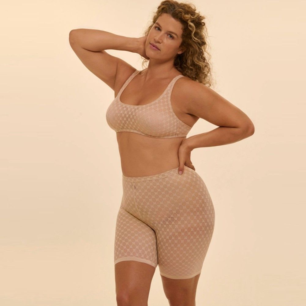 High-waisted shaping short in soft stretch tulle. Sits just under the bust for full midsection support. Mid-thigh length smooths hips and upper thighs. Lightweight and breathable shaping fabric. Flat seams for invisible wear. Stretch waistband for all-day comfort.