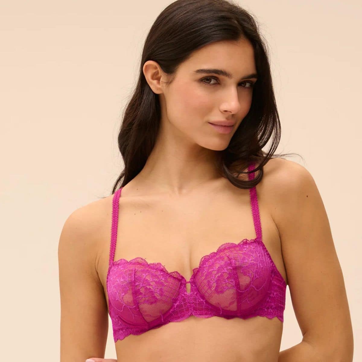 Classic Reve Half Cup Bra with underwire. It has unlined semi-sheer cups with inner tulle sling for support and shaping.