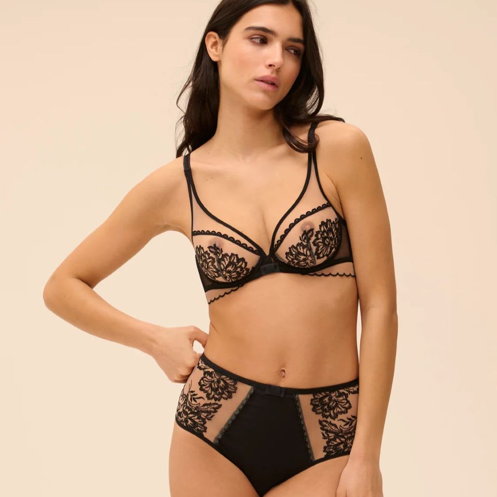 High-waisted culotte style. Nude tulle embroidered with black florals. Soft stretch knit front and back for coverage. Retro-inspired high-cut leg and waistline. Scalloped detailing and satin bow.100% cotton gusset.