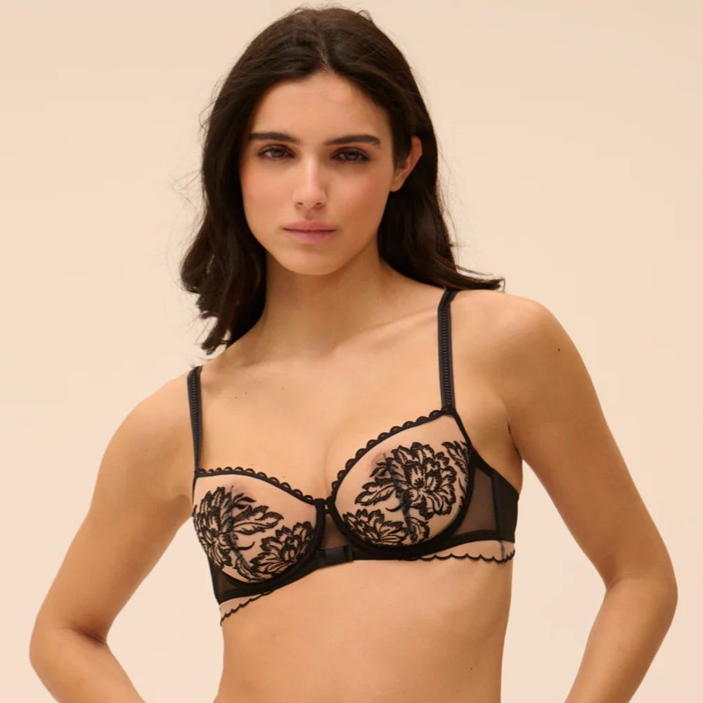 Underwired half cup bra in embroidered tulle. Balconette silhouette to enhance and lift the bust. Straight neckline with scalloped edging. Black floral embroidery on nude tulle for a tattoo-effect finish. Supportive tulle back (lined from D cup). Adjustable decorative straps. No padding.