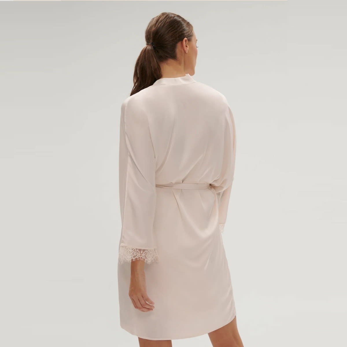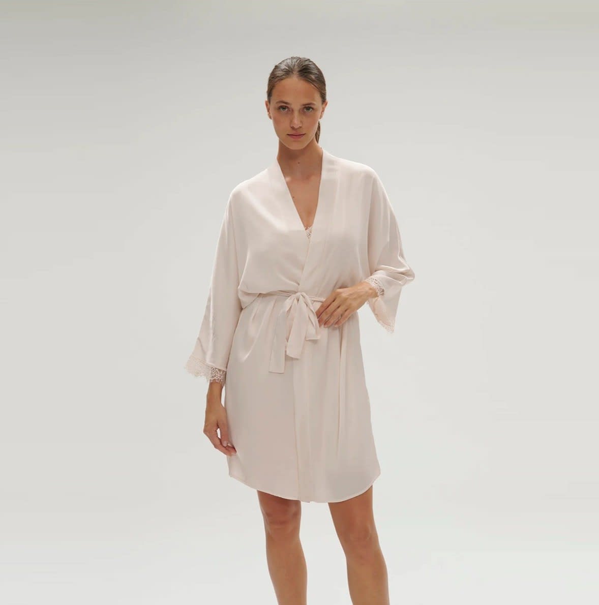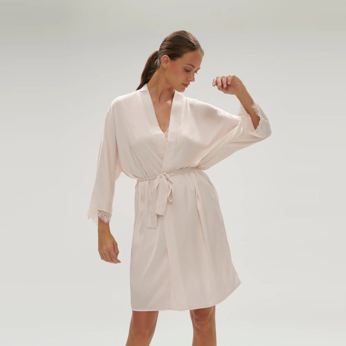 Kimono in satin and lace, ready-to-wear style. Satin in all over with lace finishes on sleeves. Mid-thigh length. Satin belt.