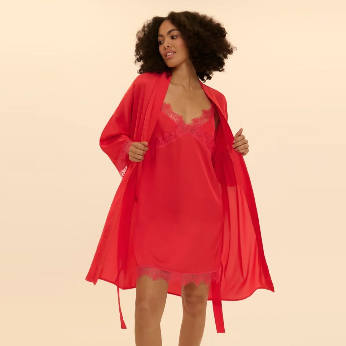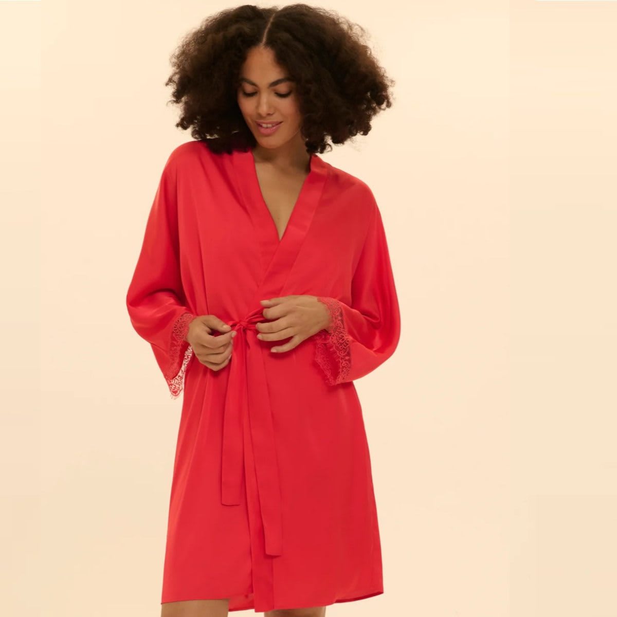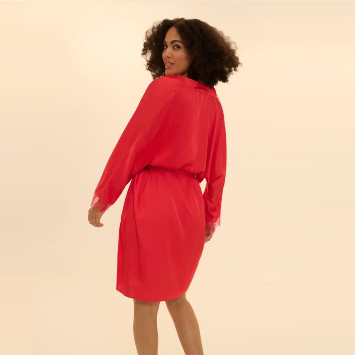 Kimono in satin and lace, ready-to-wear style. Satin in all over with lace finishes on sleeves. Mid-thigh length. Satin belt.