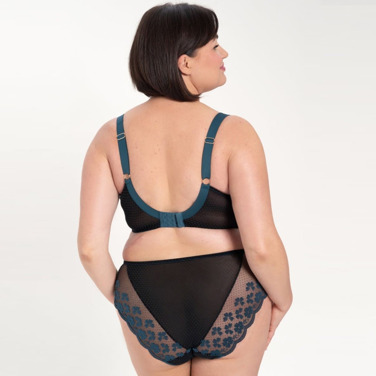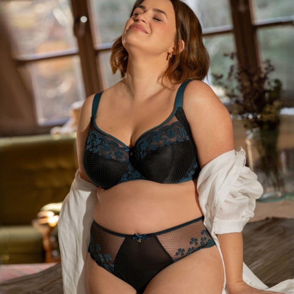 The briefs are made of wrap-around, flocked lace that decorates the buttocks.