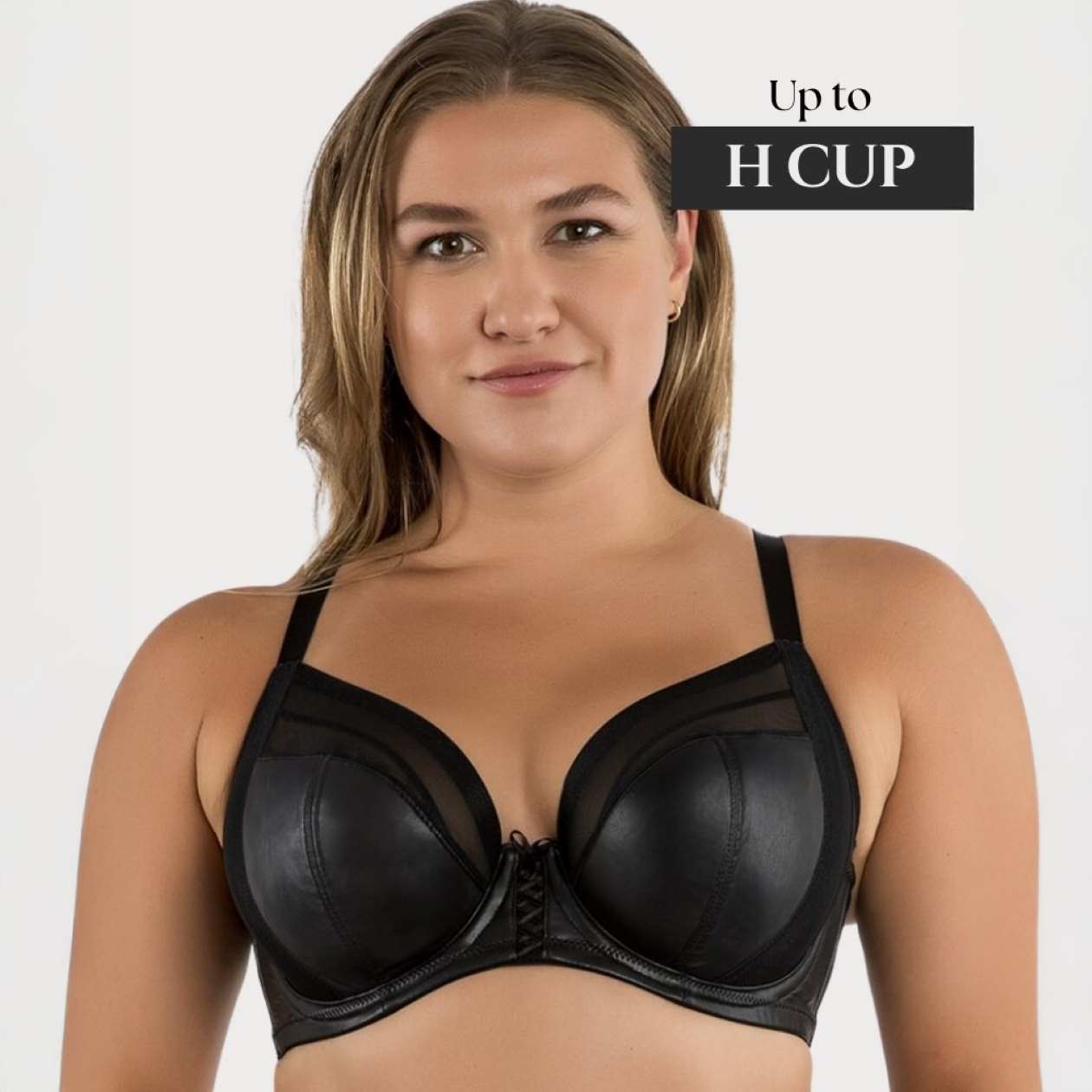 Embrace your edgy side without compromising on essential support with the Stevie Unlined Full Cup Bra, specifically designed for fuller busts. This striking unlined bra combines a bold faux leather look with sheer, striped mesh and a slight plunge neckline for a modern, provocative aesthetic. Engineered for performance, its 3-part cup design features both internal and external side slings to provide exceptional lift, shaping, and a narrower silhouette. The corsetry-inspired lacing detail at the center-front adds a unique touch, while the stretch mesh back and a versatile J-hook for racerback conversion ensure all-day comfort and wardrobe flexibility, all while maintaining a smooth look under clothing.